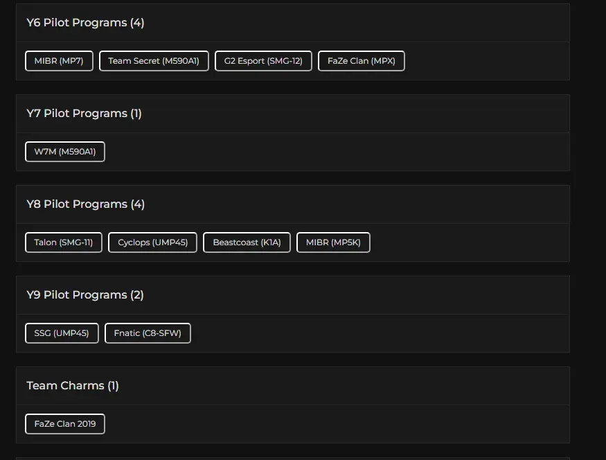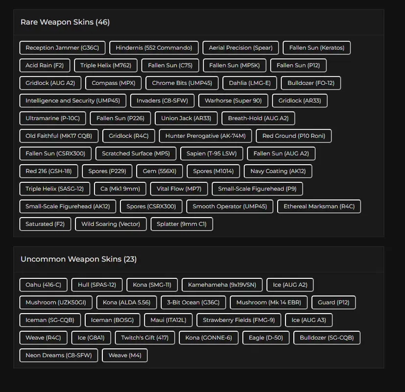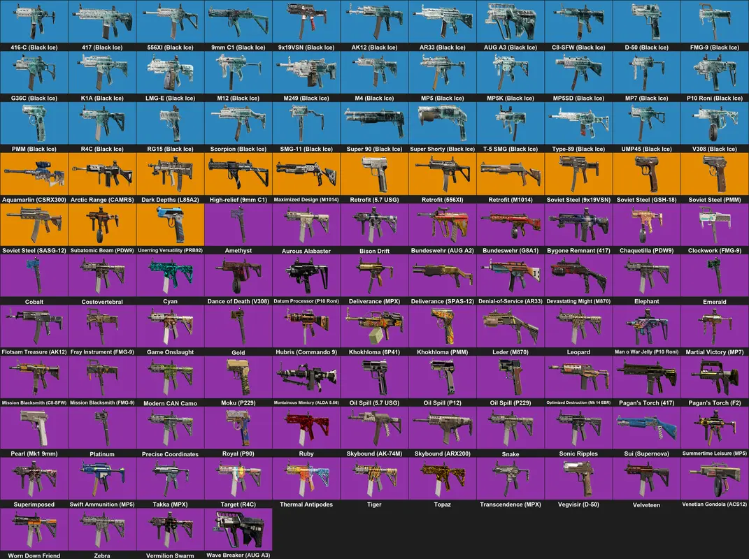 • Black Ices - (MP5K, AR33, C8-SFW, G36C, PMM, FMG-9, AK12, Super 90, 417, 416-C, 9x19VSN, UMP45, R4C, SMG-11, MP7, 556XI, 9mm C1, MP5, M4, LMG-E, V308, T-5 SMG, K1A, Super Shorty, D-50, Type-89, Scorpion, MP5SD, M12, M249, P10 Roni, AUG A3, RG15)