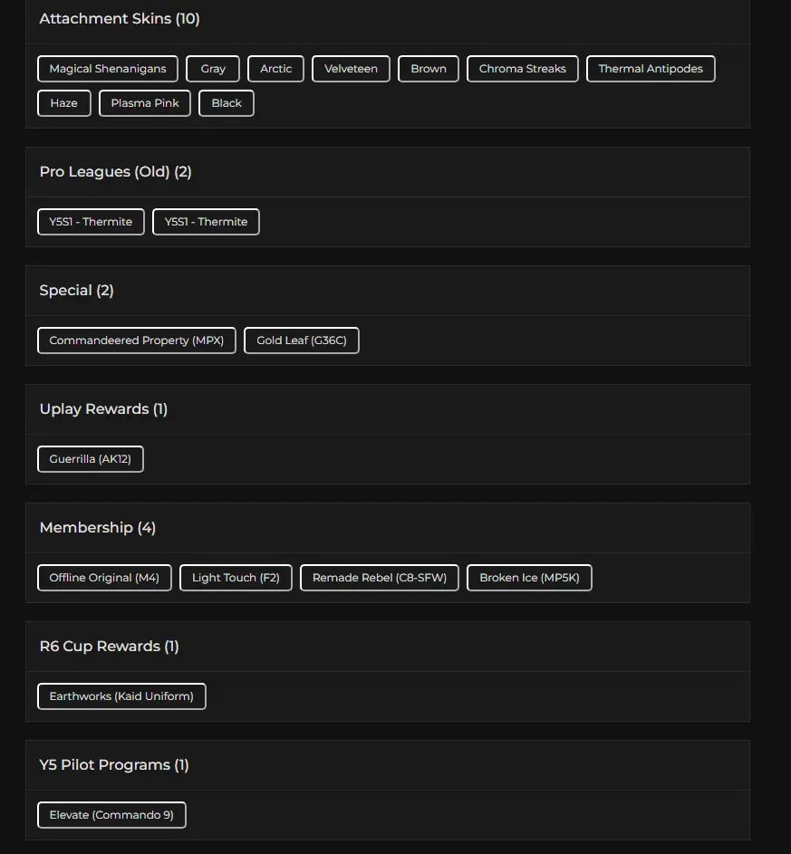 • Elite Sets: 23 (Kapkan (Vympel), Thermite (Vintage Bureau), Jager (Flying Ace), Fuze (2nd Shock Army), IQ (Reunification), Frost (Huntress), Hibana (Onkochishin), Smoke (Sanguine Arsenic), Mira (Inspiración), Ela (Huk Sztuki), Caveria (Mata-Leão), Capitao (Responsa), Ash (Tomb Raider), Zofia (Duch Bojowy), Buck (Snowdrift Expert), Maverick (Hotshot Welder), Lion (Leon S. Kennedy), Melusi (Umvikeli), Flores (Master Assassin), Ying (Augmented Reality), Alibi (Sophiscated Veneer), Nokk (Midnight Crown), Mute (The Polymath Rule))