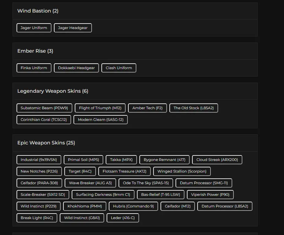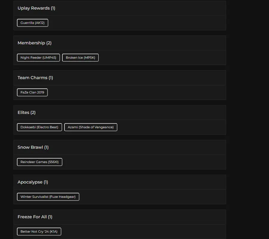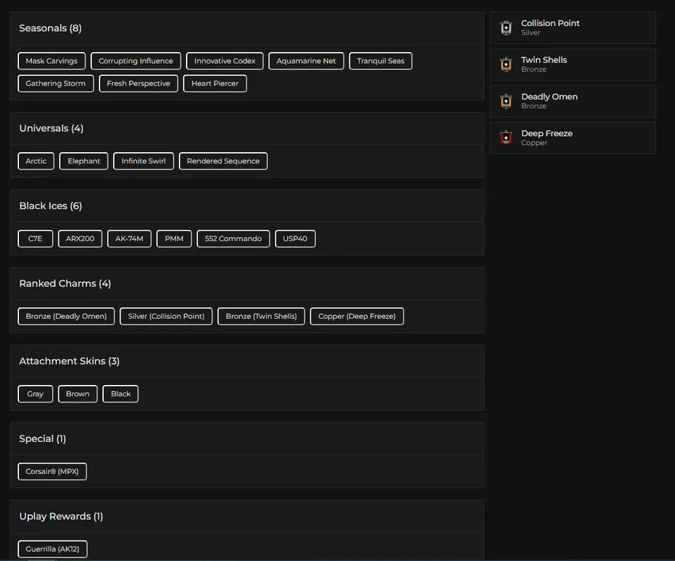 【PC/PSN/XBOX】74 Skins | 6 Black Ice | 5 Seasonals | 4 Universals | 2 Elites | 86 LVL