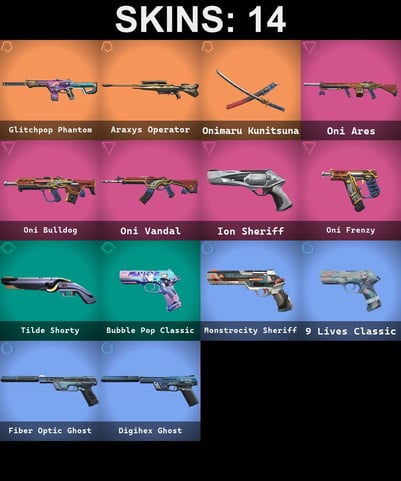 14 SKINS | 1 KNIFE | GLITCHPOP PHANTOM | ION SHERIFF | ONI VANDAL | ONI BULLDOG | ONI ARES | ONI FRENZY | ONIMARU KUNITSUNA | ARAXYS OPERATOR | TILDE SHORTY | BUBBLE POP CLASSIC | MONSTROCITY SHERIFF | 9 LIVES CLASSIC | FIBER OPTI