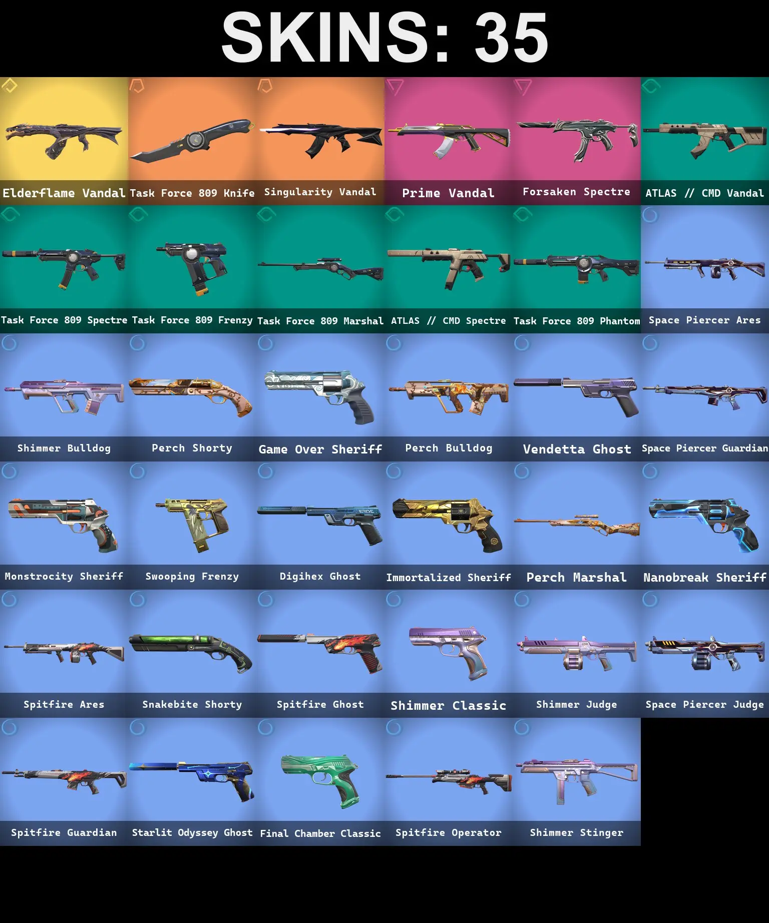 35 SKINS | 1 KNIFE | ELDERFLAME VANDAL | PRIME VANDAL | FORSAKEN SPECTRE | SINGULARITY VANDAL | TASK FORCE 809 KNIFE | ATLAS // CMD VANDAL | TASK FORCE 809 SPECTRE | TASK FORCE 809 FRENZY | TASK FORCE 809 MARSHAL | ATLAS // CMD SP