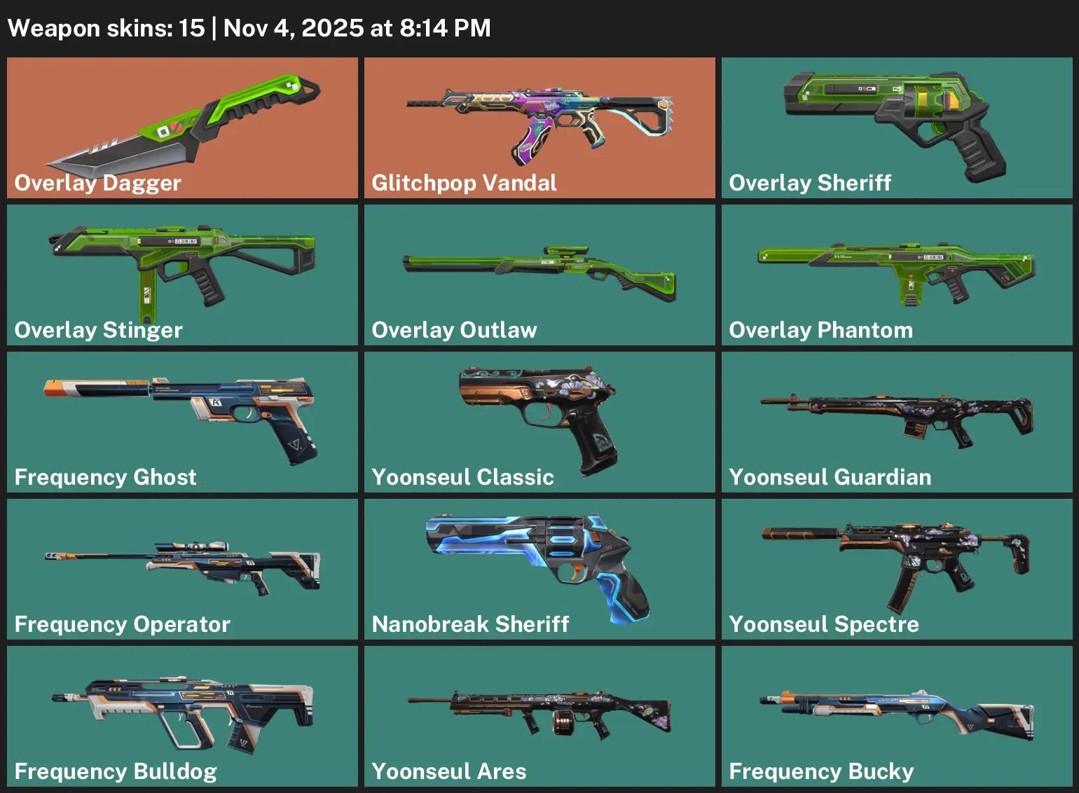 😗 AP 🚢 Bronze 3 🚌 15 Skins 🛡 100 VP 🏝 12 Agents 🧷 Value: 2175 VP 🐭 Overlay Dagger 🥹 Glitchpop Vandal 🥄 Overlay Sheriff 🐩 Overlay Stinger 😂 Overlay Outlaw 😊 Overlay Phantom