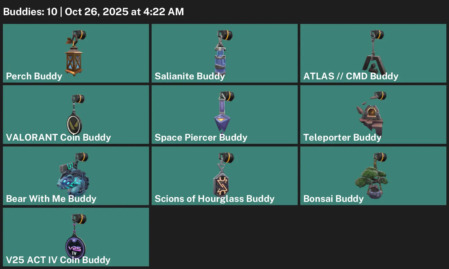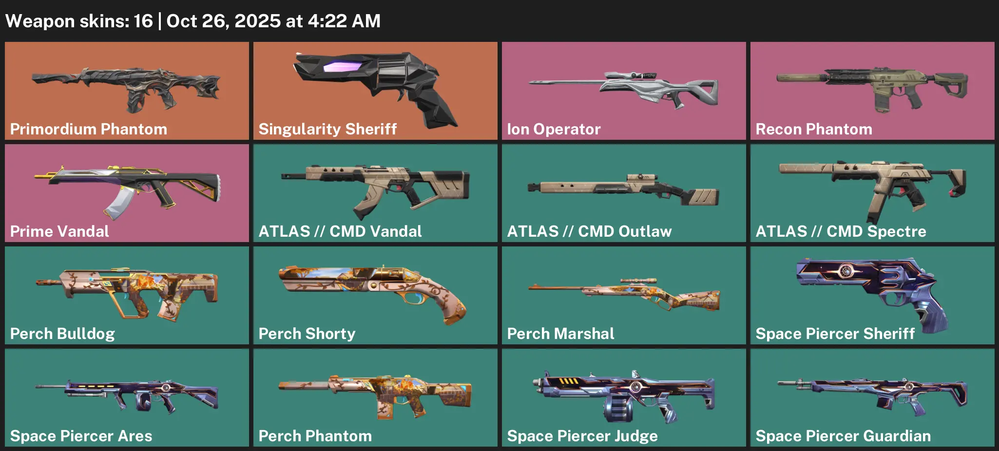 📆 AP 🛍 Unranked 🦍 16 Skins 😻 322 VP 🎣 4 Agents 🍺 Value: 9675 VP 🍄 Primordium Phantom 🫔 Singularity Sheriff 📤 Ion Operator 📦 Recon Phantom 🦧 Prime Vandal 🥑 ATLAS // CMD Vandal