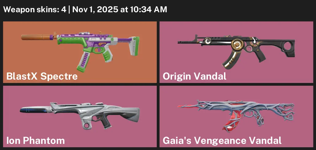 😮💨 AP 🍡 Unranked 🥿 4 Skins 🍰 337 VP 🦔 15 Agents 🔏 Value: 7500 VP ⛓ BlastX Spectre 🤾 Origin Vandal 🎄 Ion Phantom 🥫 Gaia's Vengeance Vandal