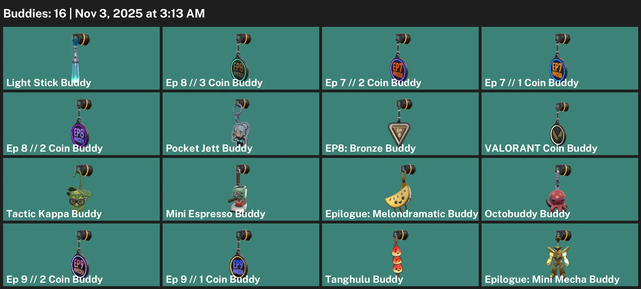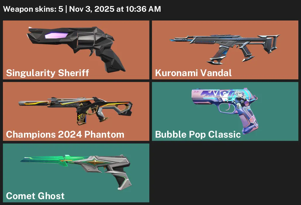 🪓 AP 📌 Unranked ⛏ 5 Skins 🐦 87 VP 🪙 16 Agents 👗 Value: 7225 VP 🌼 Singularity Sheriff 🥜 Kuronami Vandal 📩 Champions 2024 Phantom 🧶 Bubble Pop Classic ⛲️ Comet Ghost