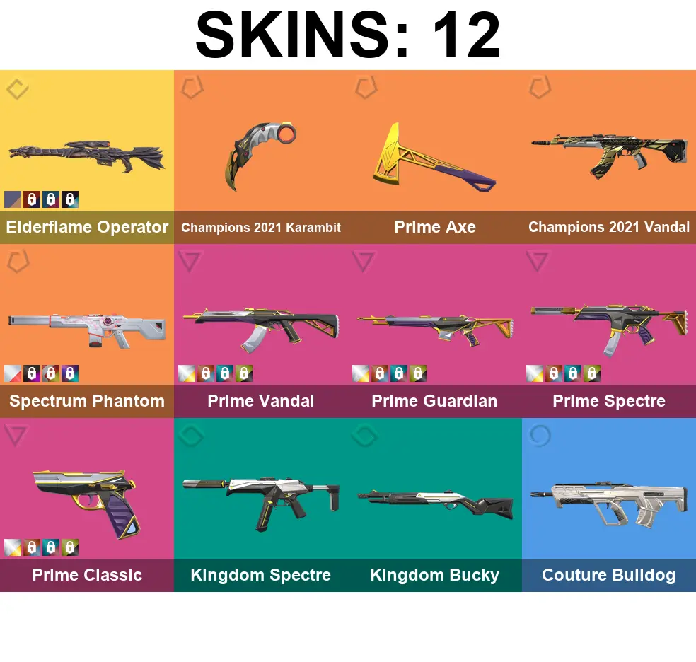 ASIA/SEA/OCE | 12 Skins + 2 Knives | Elderflame Operator | Champions 2021 Karambit | Prime Axe | Champions 2021 Vandal | Spectrum Phantom | Prime Vandal | Prime Guardian | Prime Spectre | Prime Classic | Kingdom Spectre | Kingdom Bucky