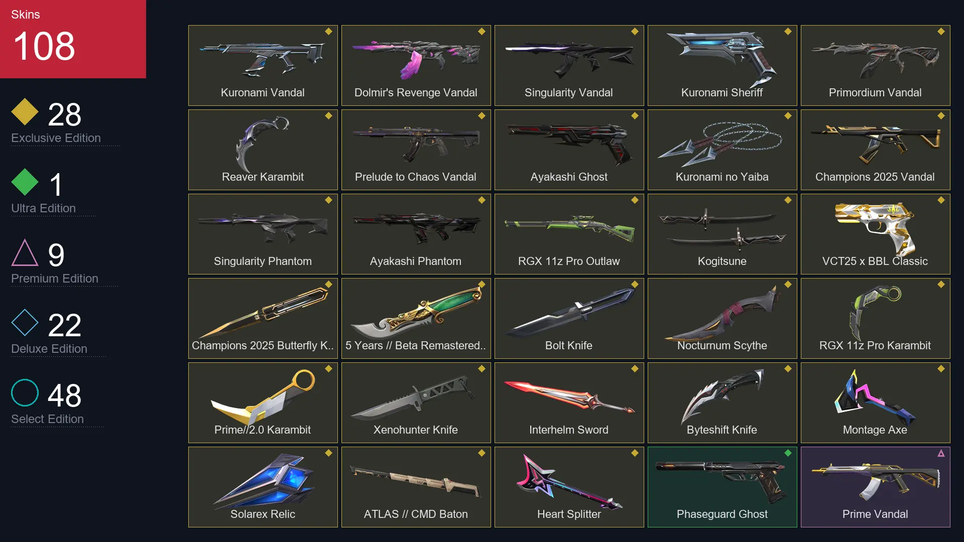 🐲 EU 🌀 108 Skins ☄️ 24 Agents 🎮 198 Level 💫 🌌 Prime Vandal 🎭 Kuronami Vandal 💰 Dolmir's Revenge Vandal 🏵️ Singularity Vandal 🥝 Recon Guardian +103 more
