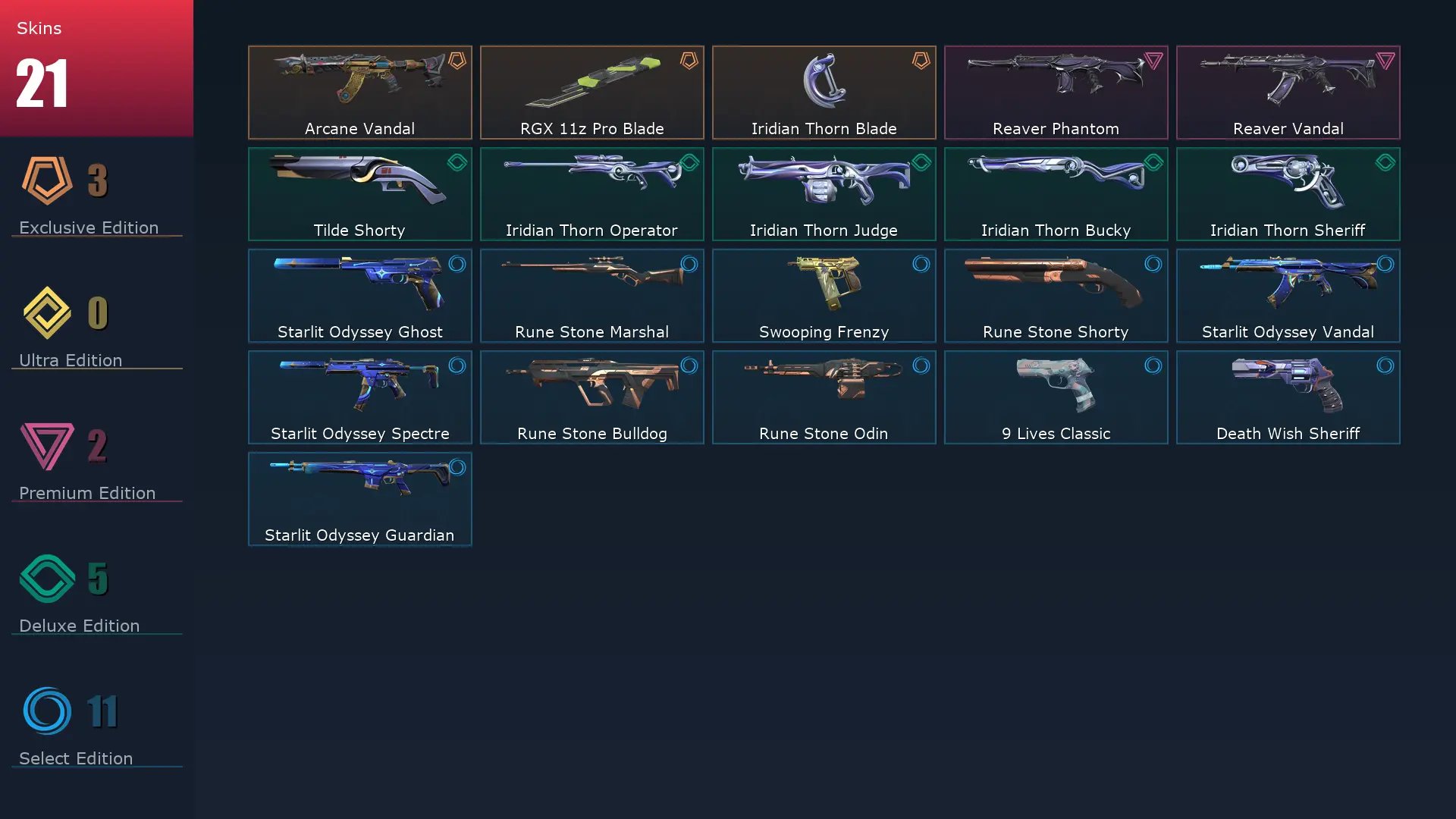 EU 🦬 21 Skins 🩼 28 Agents 🏂 147 Level 👔 Arcane Vandal 🦮 Tilde Shorty 🐯 Starlit Odyssey Ghost ⛴ Reaver Phantom 🧧 RGX 11z Pro Blade ⚖️ Reaver Vandal