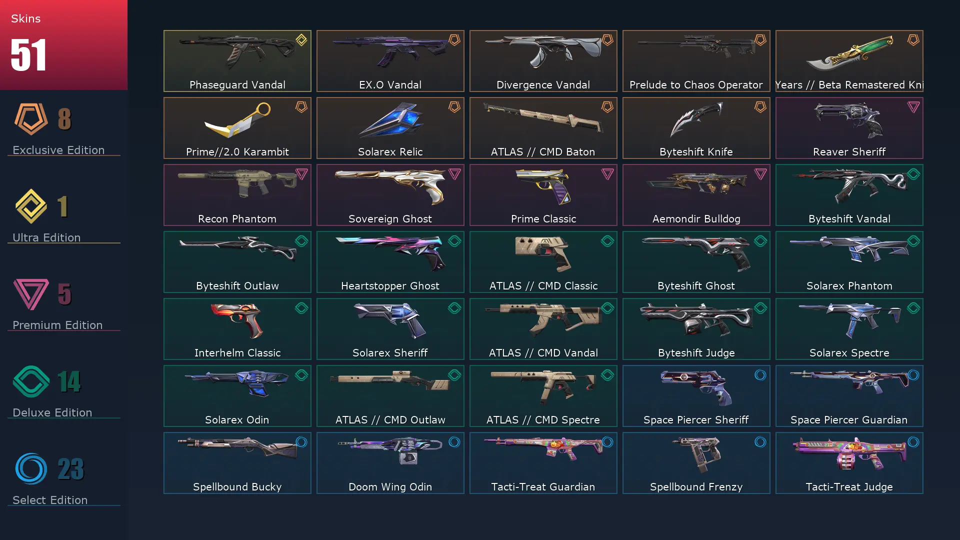 EU 🎭 51 Skins 🌄 28 Agents 😄 103 Level 🐁 EX.O Vandal 🐬 Prelude to Chaos Operator 🐷 Aemondir Bulldog 🐹 Sovereign Ghost 🚌 Reaver Sheriff 🗳 Phaseguard Vandal ⛴ Prime//2.0 Karambit 🌩 Byteshift Outlaw 🦬 Divergence Vandal