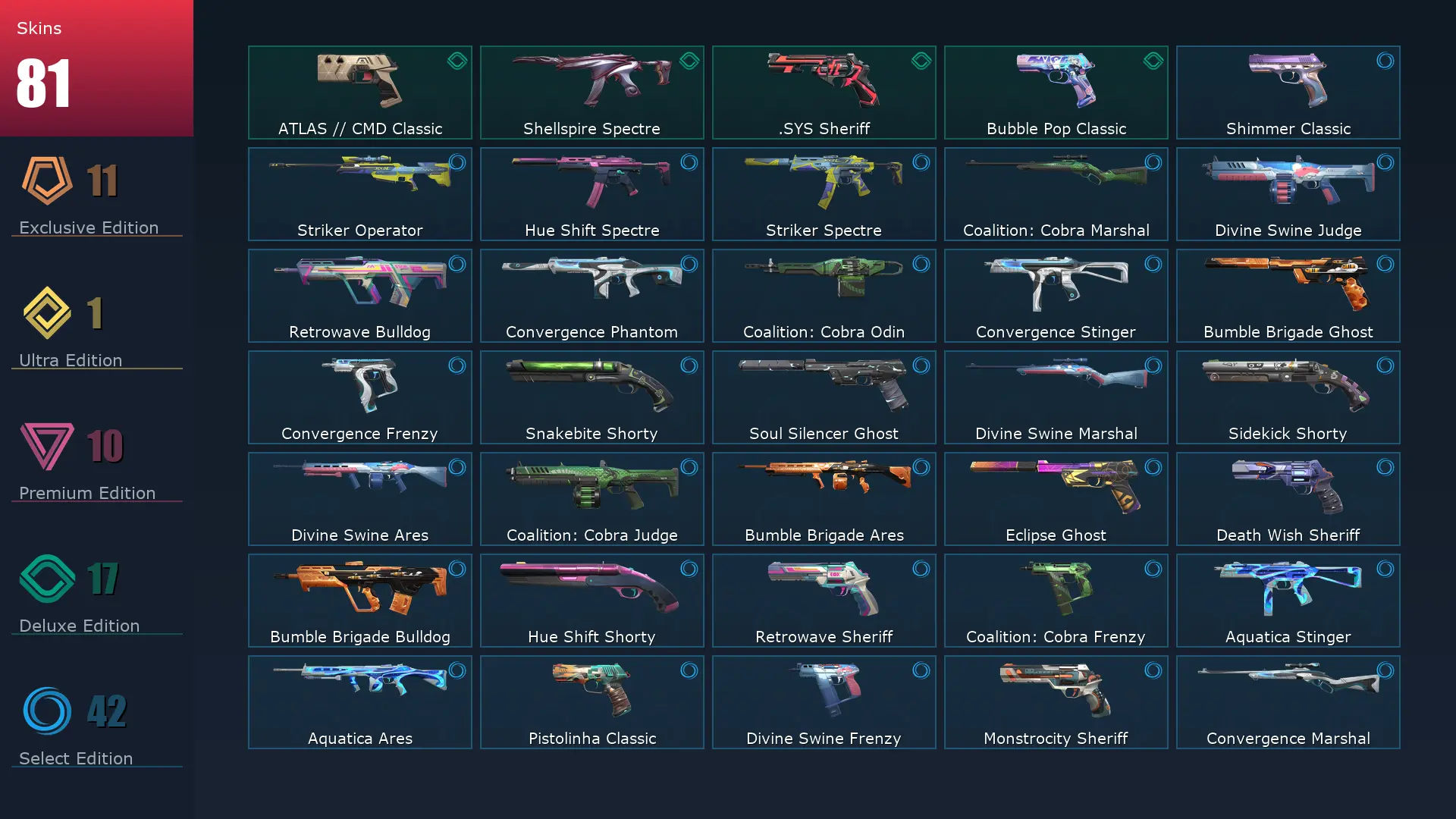 EU 🏅 81 Skins 🍠 28 Agents 🍟 238 Level 🎽 Coalition: Cobra Marshal 📍 Mystbloom Sheriff 🖨 Prime Spectre 🪂 Prime Vandal 📉 Neo Frontier Sheriff 🍣 RGX 11z Pro Karambit 🏆 XERØFANG Ghost 🥍 Reaver Phantom 🦩 Overdrive Vandal 🌂 Hue Shift Spectre