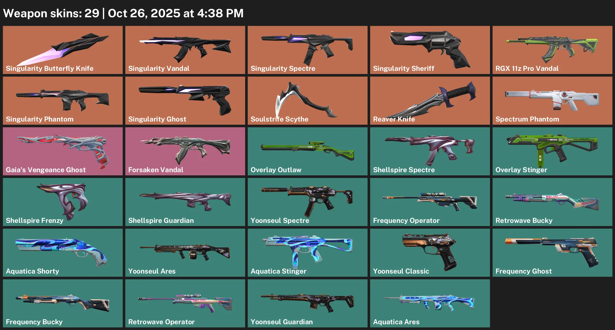 😮 EU 🎊 Unranked 🎱 29 Skins 🛵 339 VP 🪵 12 Agents 🤼♀️ Value: 30725 VP 🎾 Singularity Butterfly Knife 🦛 Singularity Vandal 🖲 Singularity Spectre 📟 Singularity Sheriff 🧱 RGX 11z Pro Vandal 🙀 Singularity Phantom