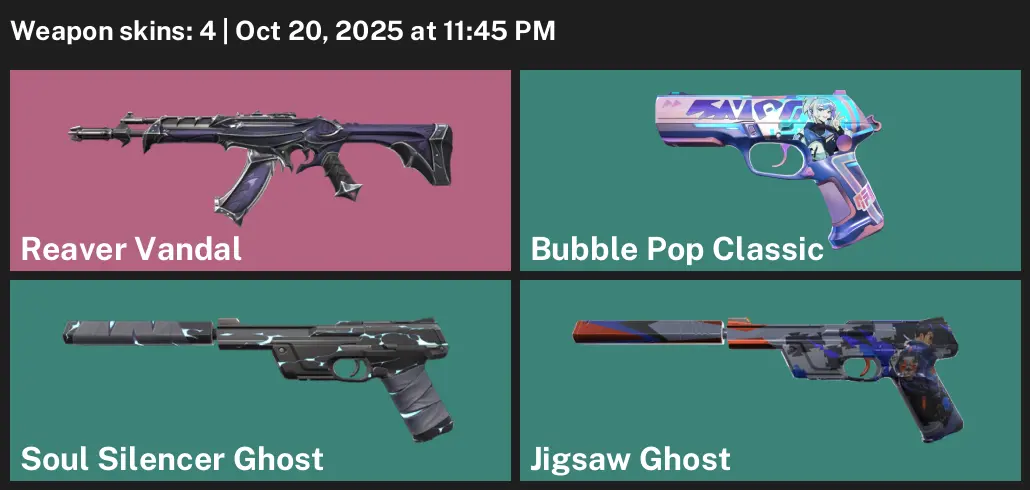 👍 EU 🦄 Unranked 🧣 4 Skins 😿 400 VP 🍣 21 Agents 📮 Value: 1775 VP 🦺 Reaver Vandal 🥪 Bubble Pop Classic 🍗 Soul Silencer Ghost 🦻 Jigsaw Ghost