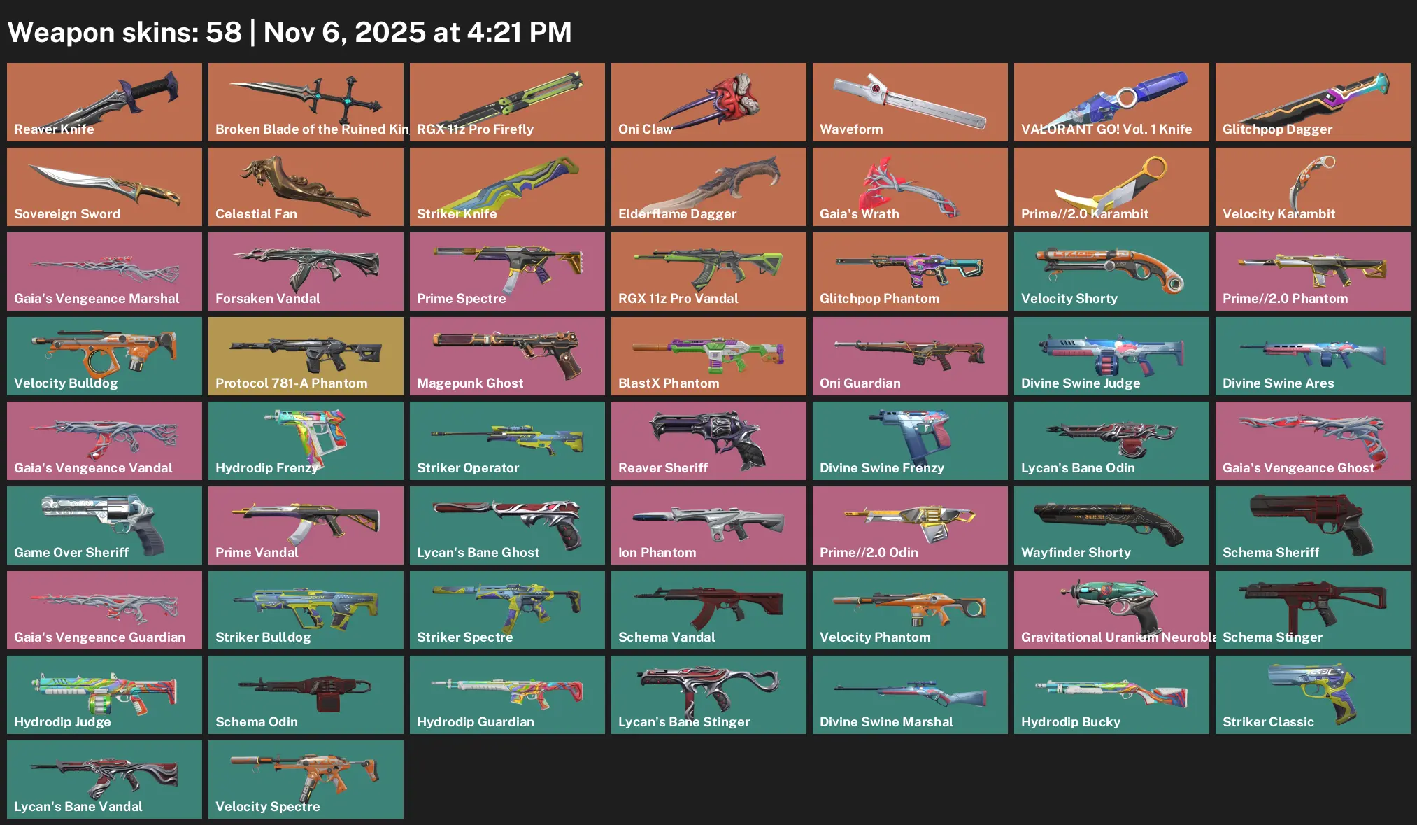 🥮 EU 🎮 Unranked 🐆 58 Skins 💅 30 VP 🦵 7 Agents 🏗 Value: 82050 VP 🌺 Reaver Knife ⛩ Broken Blade of the Ruined King 👑 RGX 11z Pro Firefly 🤾♀️ Oni Claw 📊 Waveform 🏑 VALORANT GO! Vol. 1 Knife