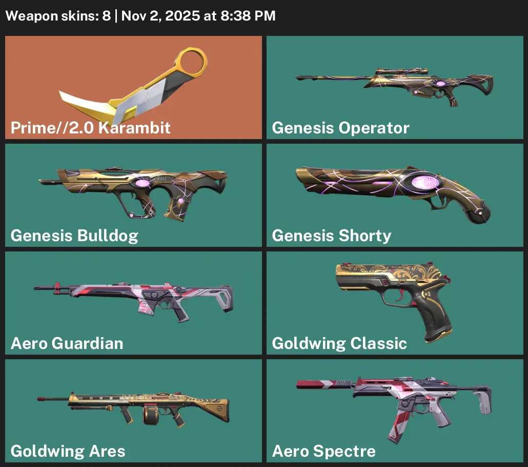 🪳 EU 😎 Unranked 🖐 8 Skins 📝 100 VP 🌼 3 Agents 🥐 Value: 3550 VP 😁 Prime//2.0 Karambit 👕 Genesis Operator 🚝 Genesis Bulldog ⚓️ Genesis Shorty 🚽 Aero Guardian 😩 Goldwing Classic