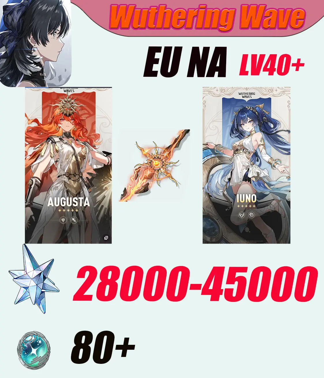 [NA]LV40|[Augusta+Augusta arms]+Iuno+28000-30000 Star Voice||80+ Summoning Vortex|Random gender|Wuthering Waves