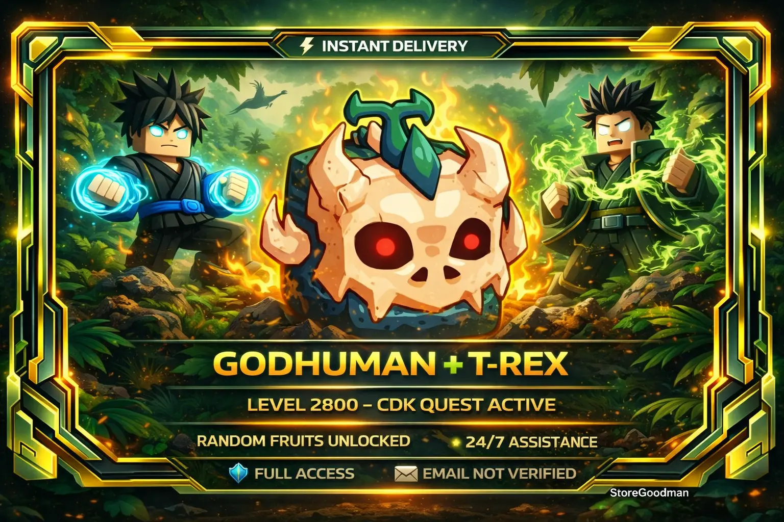 🔥 Godhuman + T-rex Fruit 🔥 Level 2800 CDK Quest Active 🍑 Random Fruits Unlocked 24/7 Assistance 💠 Full Access 📧 Email Not Verified #EAF2S