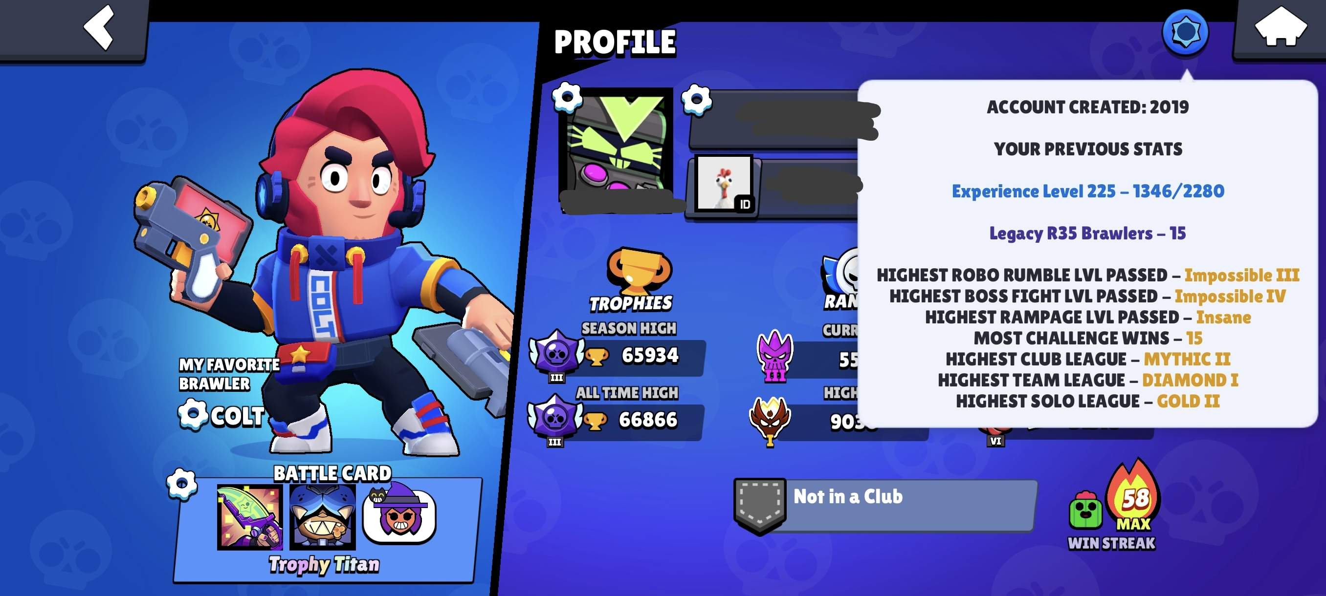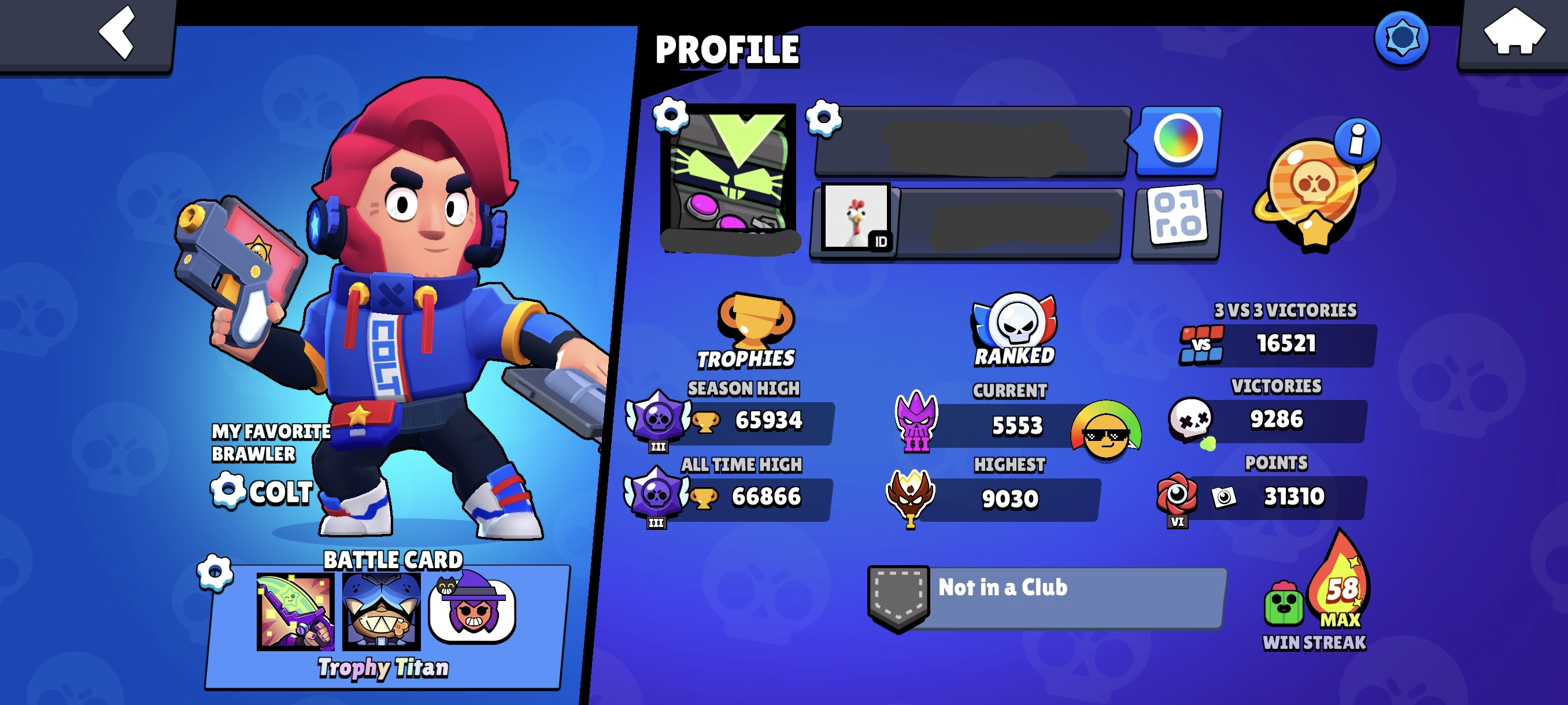 ✨ 66k Trophy ✨ 15x Legacy r 35 ✨ Challanger Colt ✨ Virus 8-Bit ✨ Witch Shelly ✨ Heroine Bibi ✨ WareWolf Leon ✨ Royal Agent Colt ✨ 6x Og Brawl Passes ✨ 1x Old Masters ✨