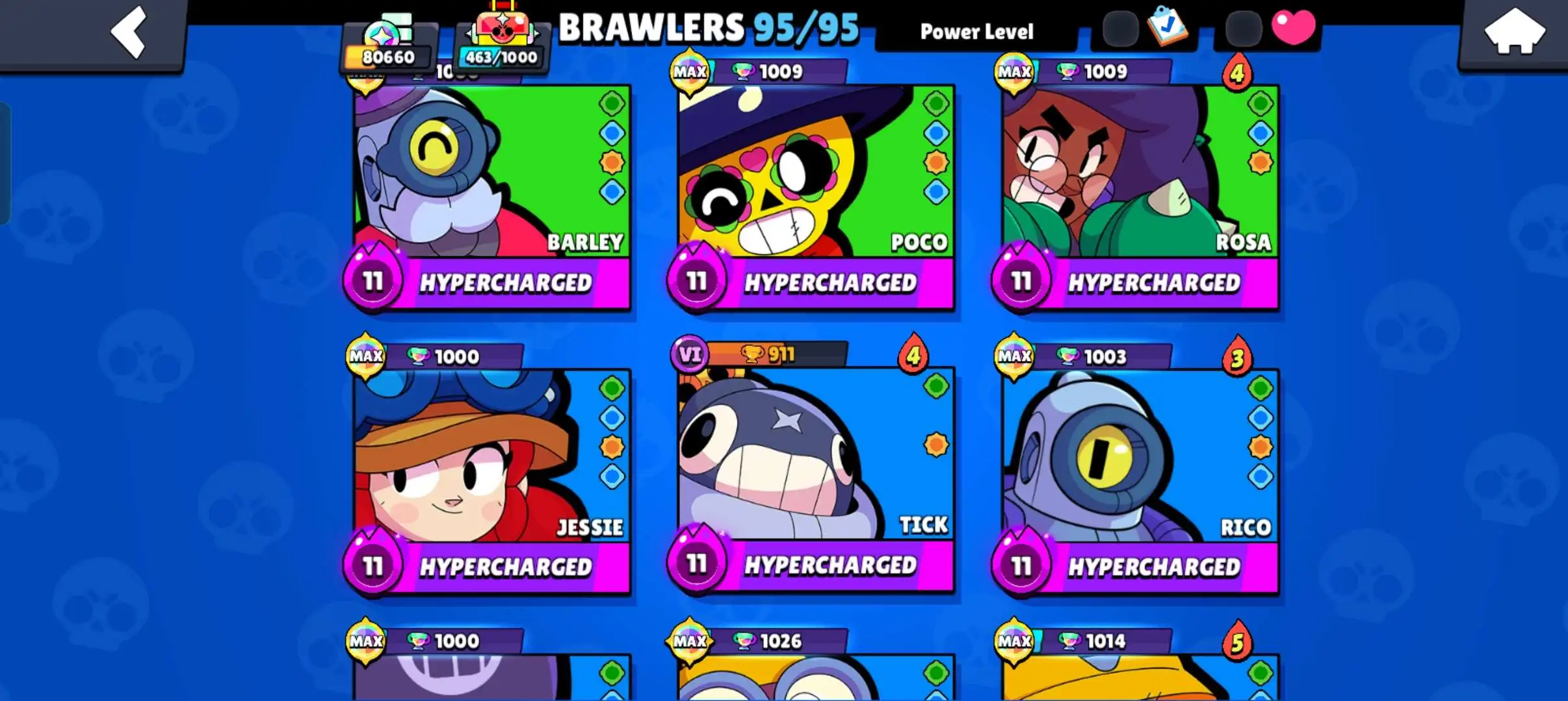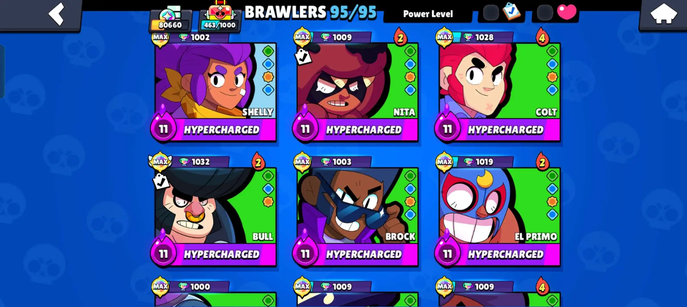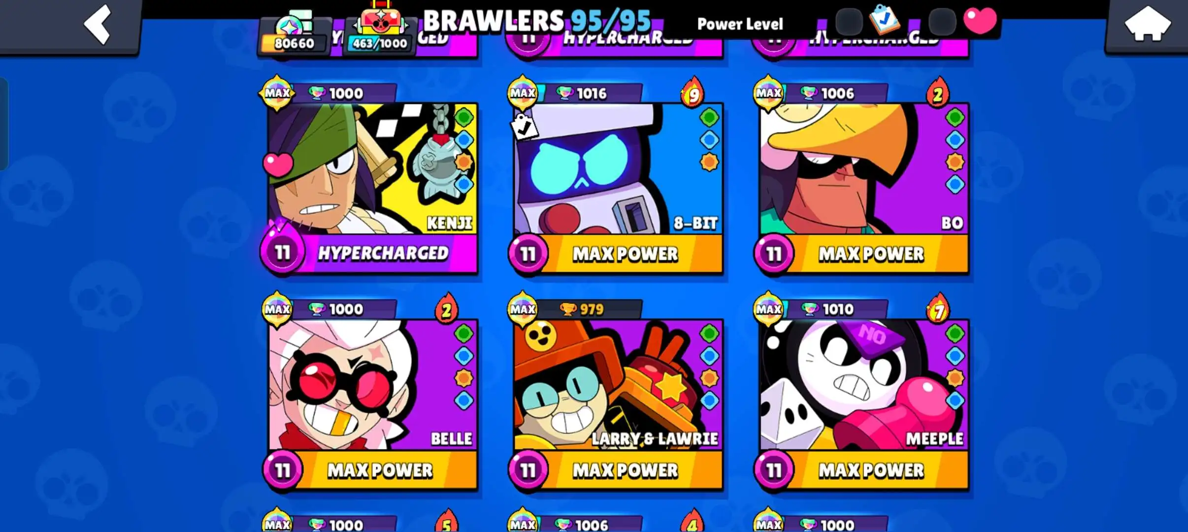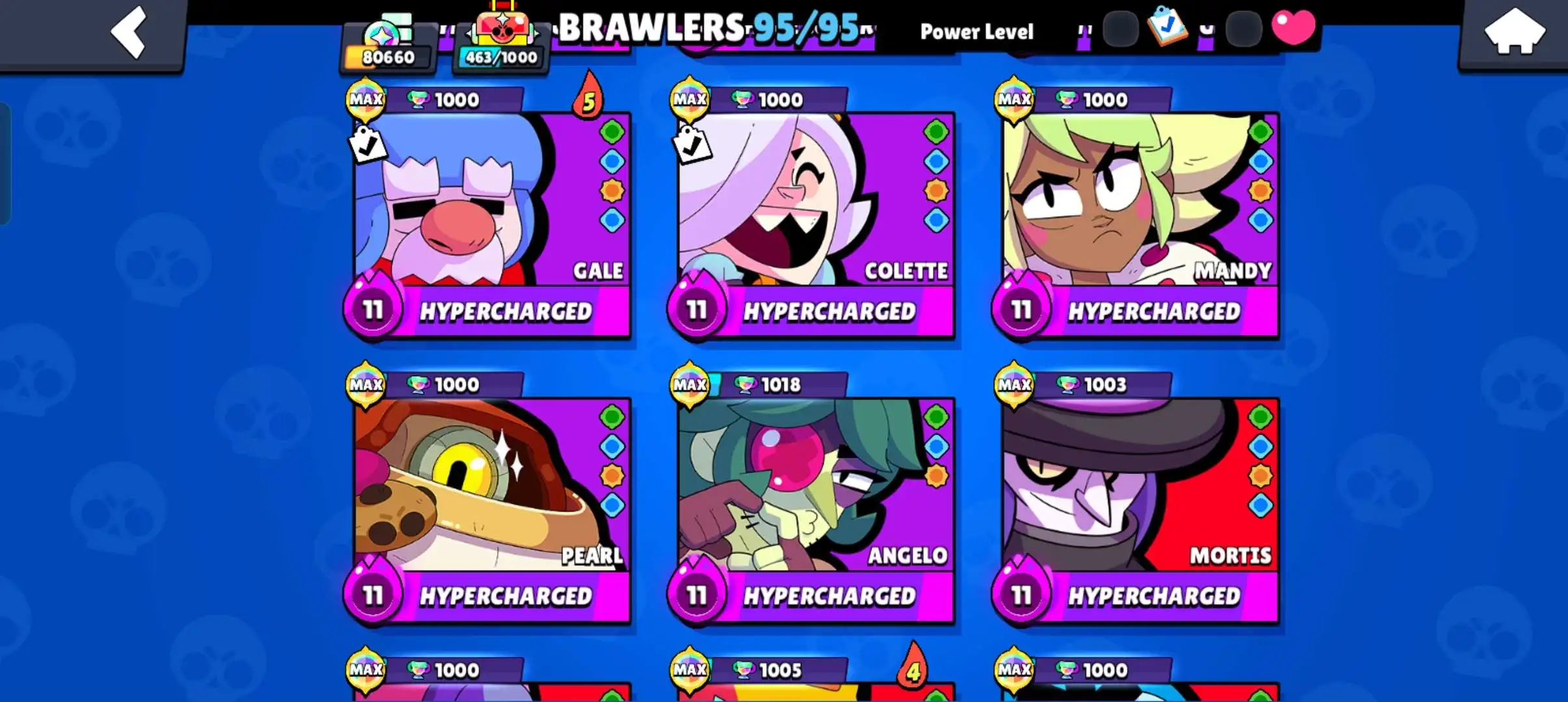 80k 🏆 3 time masters 🔥 1 prestige 🔥9 brawl pass plus 🔥16 Legendry skins 🔥 max (63) ✅ 330 skins ✅ 57 hypercharges ✨