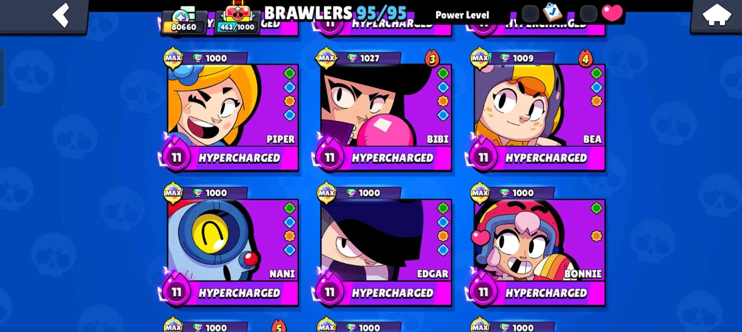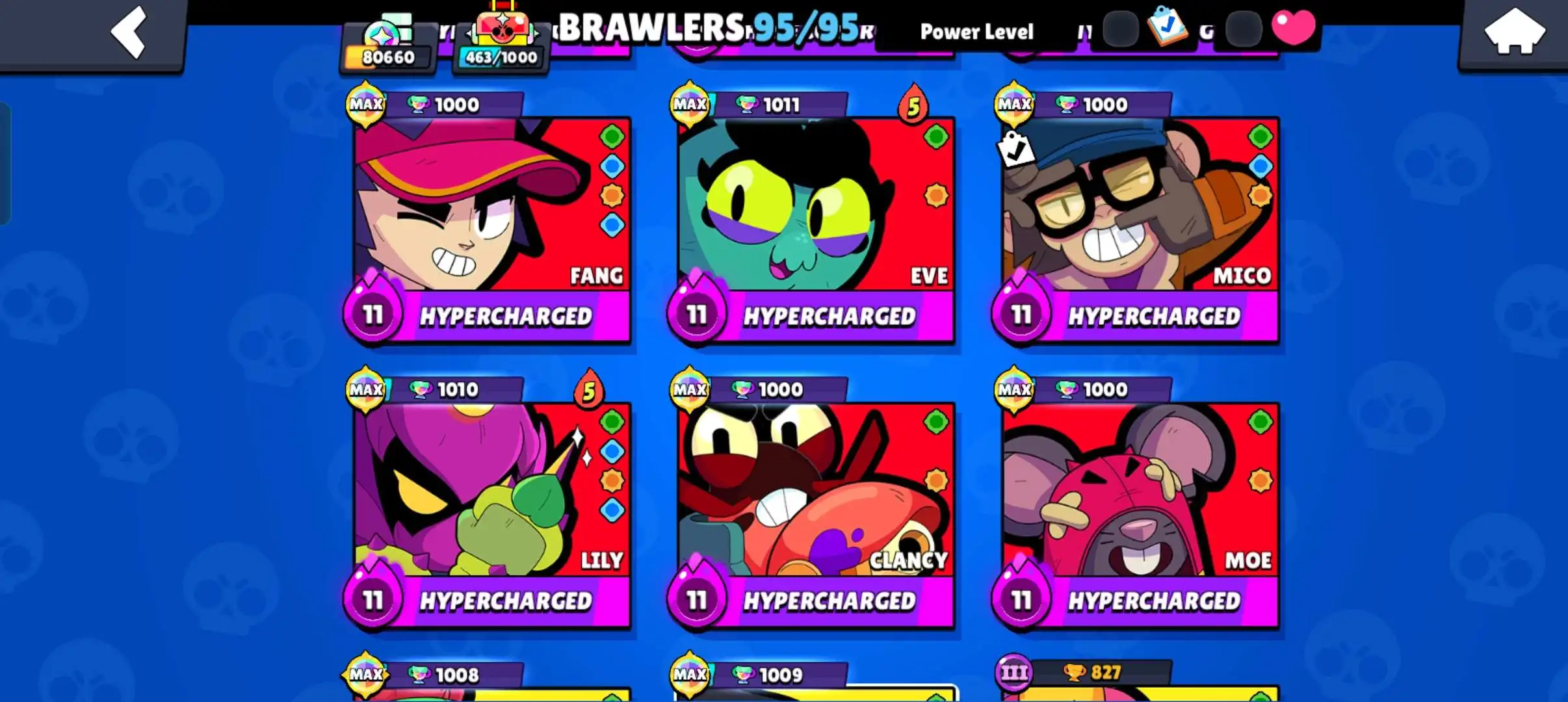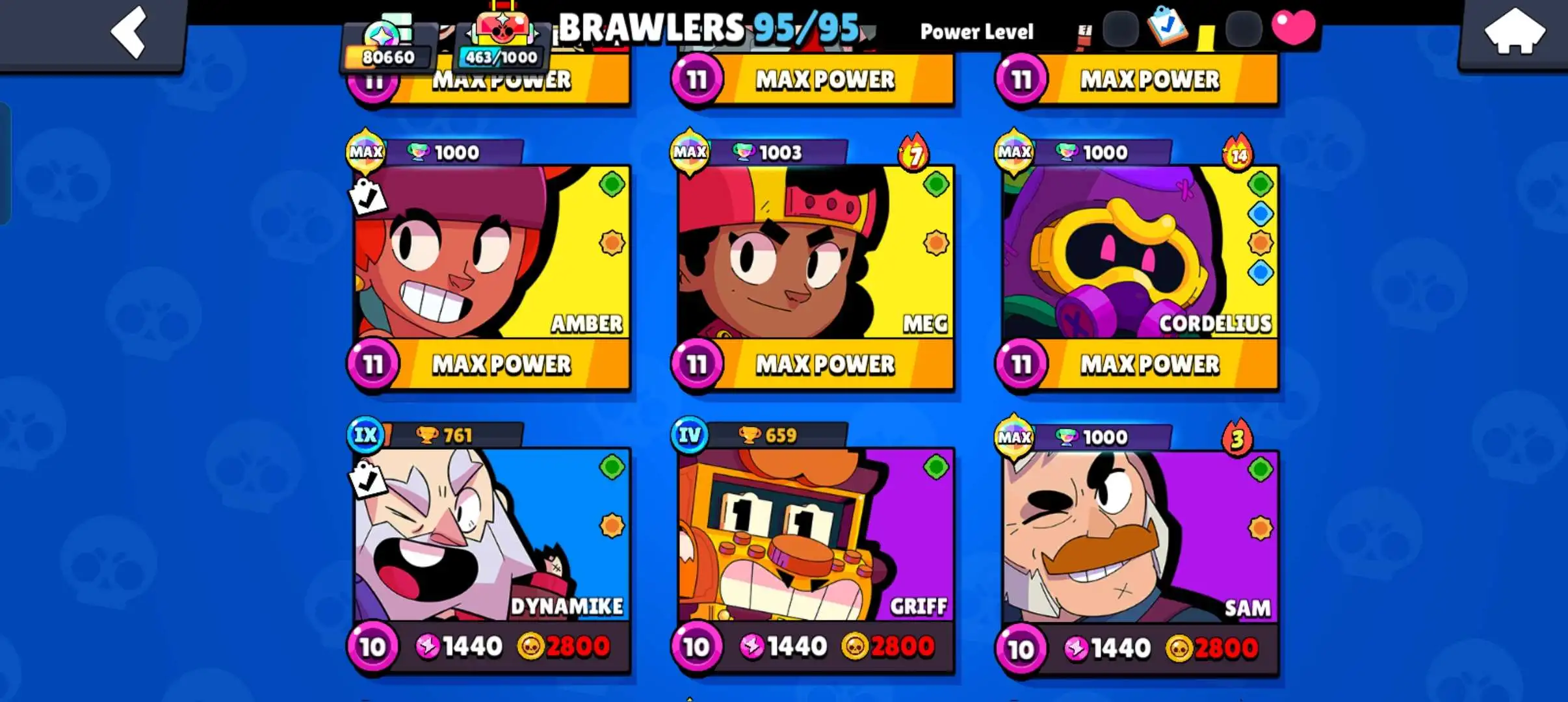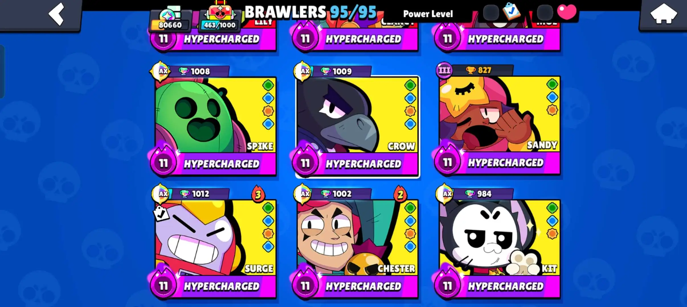80k 🏆 3 time masters 🔥 1 prestige 🔥9 brawl pass plus 🔥16 Legendry skins 🔥 max (63) ✅ 330 skins ✅ 57 hypercharges ✨