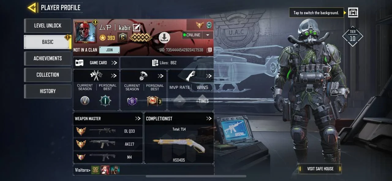iOS Android 😶🌫️ Level 393 🏆 Rank Master 💯 141 Epic 🎯 6 Legendery 🧨 1 Mytich ☠️ 52 Epic Soldier 🥳 Code505