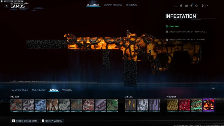 Infestation kendisi, Doomsteel kamuflajının tüm 30 silah için kazanılmasıyla otomatik olarak açılır, her silaha ayrı ayrı tamamlama gerektirmeden aynı anda uygulanır. Kamuflaj, benzersiz animasyonlu bir görünüme sahiptir; silah ateşlendiğinde tepki veren titrek koyu uzantılar ve renk değiştiren kas lifleri bulunmaktadır, bu da onu BO7’de görsel olarak en zorlu kilit açmalardan biri yapar.