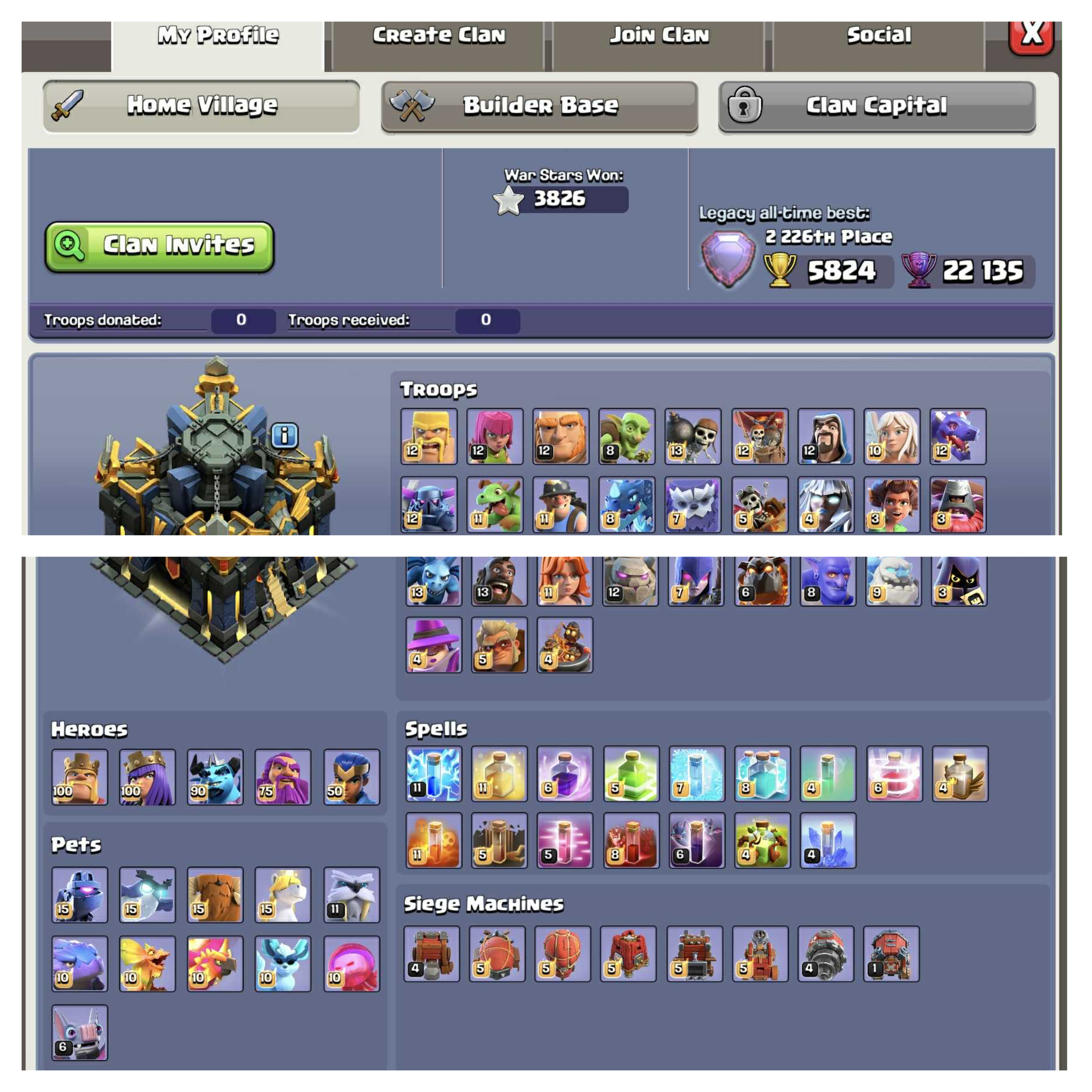 Level 250🌷TH 17 Max Almost🌷League Skin🌷5.5k+ Gems🌷6 Epic Equipments Max