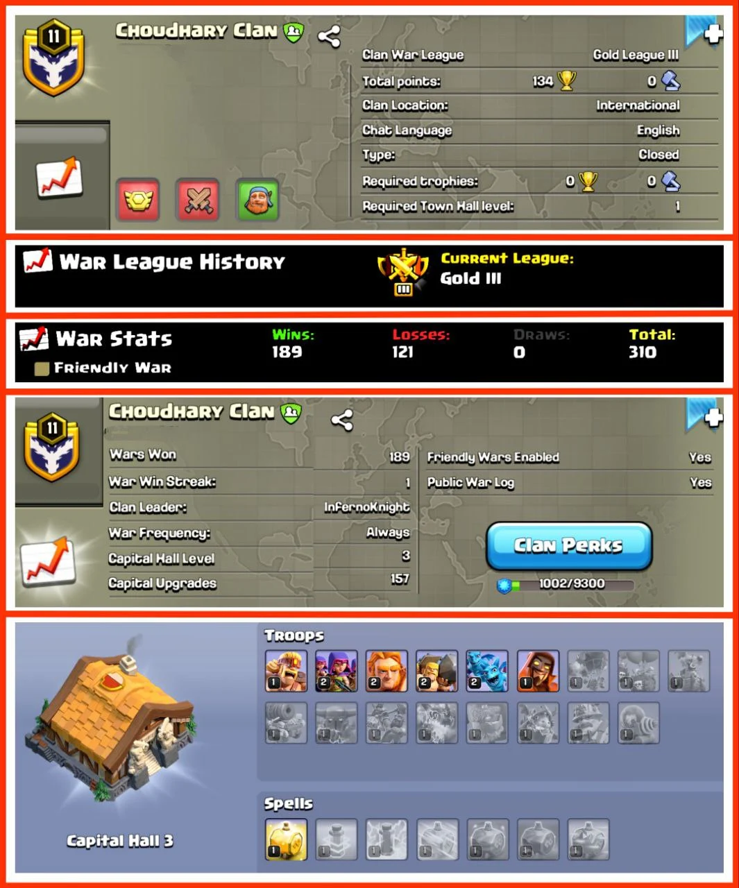 💥CRAZY PRICE💥 🔥OP 11 LEVEL ENGLISH CLAN 💥 NICE NAME : CHOUDHARY CLAN 👅 LEAUGE : GOLD 3 ♨️ CLAN CAPITAL : 3💧WINS : 189 | LOSS : 121 ⭐ BEST CLAN BUY NOW ⚡ FAST DELIVERY🚚