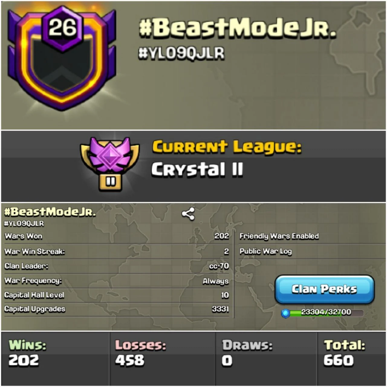 A122 | High Lvl 26 | Perfect English Name_#BeastModeJr | Almost Lvl 27 | Full Max Capital Hall | Max CC Lvl 10 | Crystal Leauge 2 | Decent War Log | Very Affordable Price |