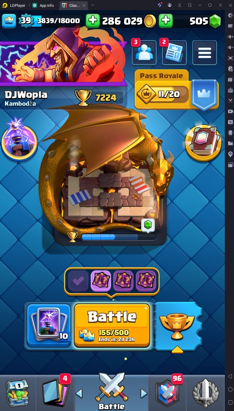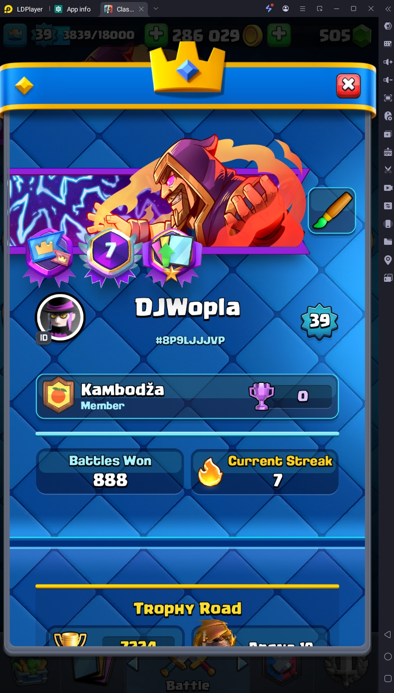 7224 TROPHY 🏆 39 LVL 💯 KT 13 👑 118 CARDS ♦️ 1 MAX CARDS 👑 0 ELITE CARDS 🔮 3 EVO 💯 EMOTE 30 🎭 #8P9LJJJVP ⸱ TAG ACCOUNT ♥️