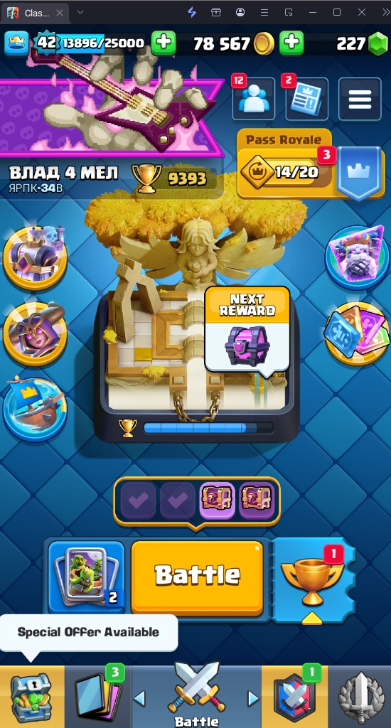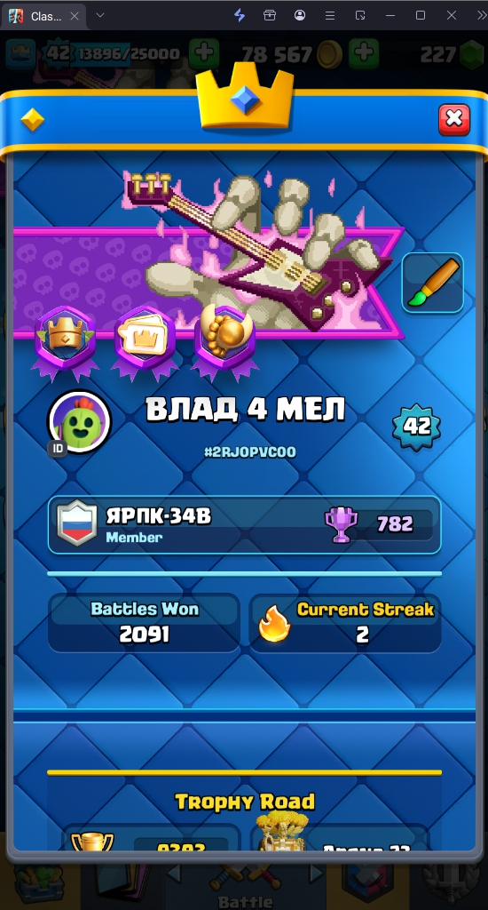 9393 TROPHY 🏆 42 LVL 💯 KT 14 👑 119 CARDS ♦️ 18 MAX CARDS 👑 13 ELITE CARDS  🔮 4 EVO 💯 EMOTE 50 🎭 #2RJ0PVC00 ⸱ TAG ACCOUNT ♥️