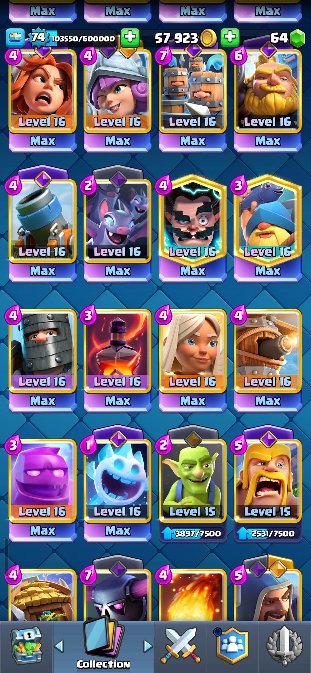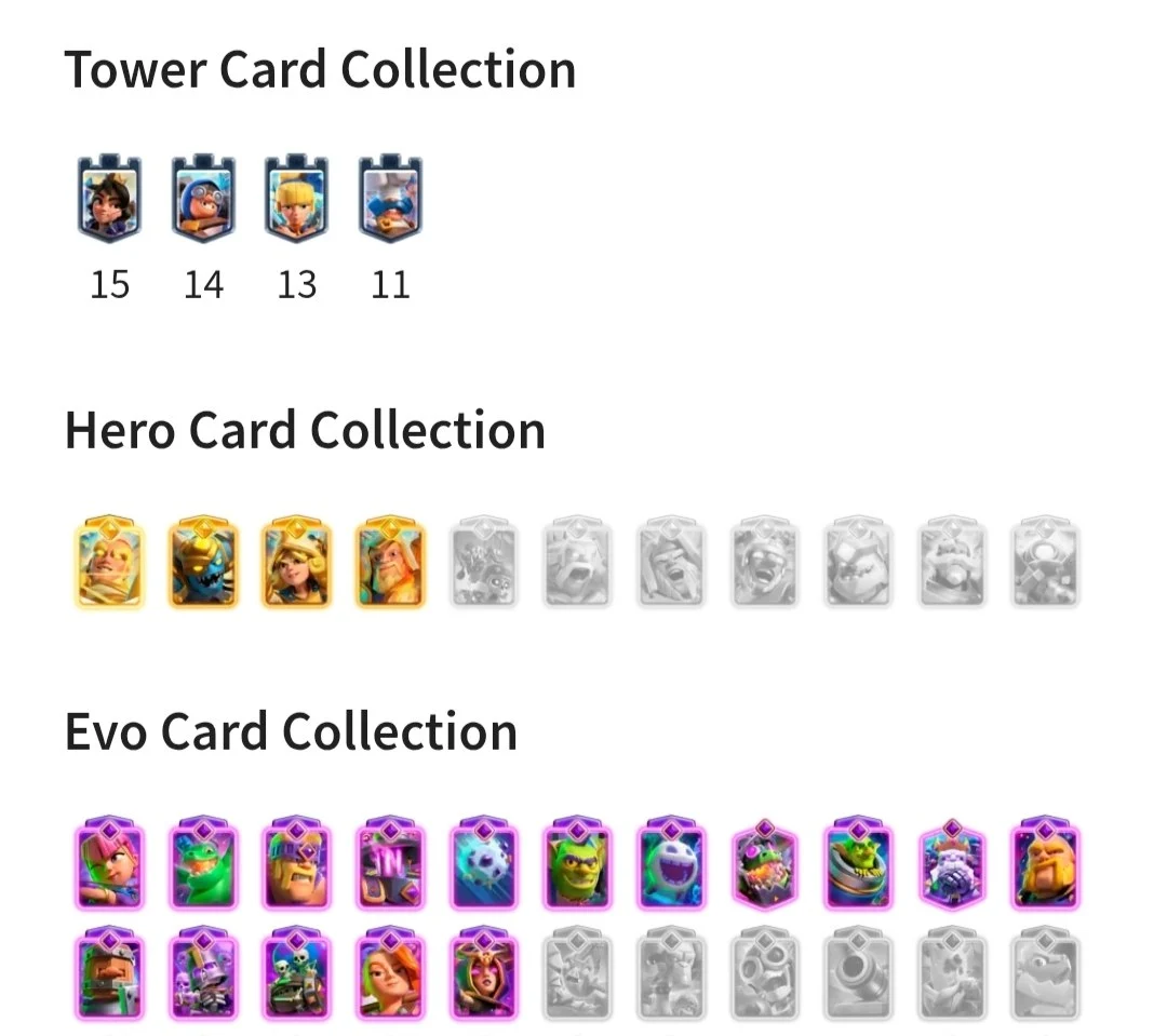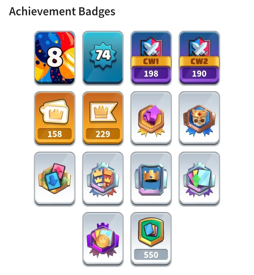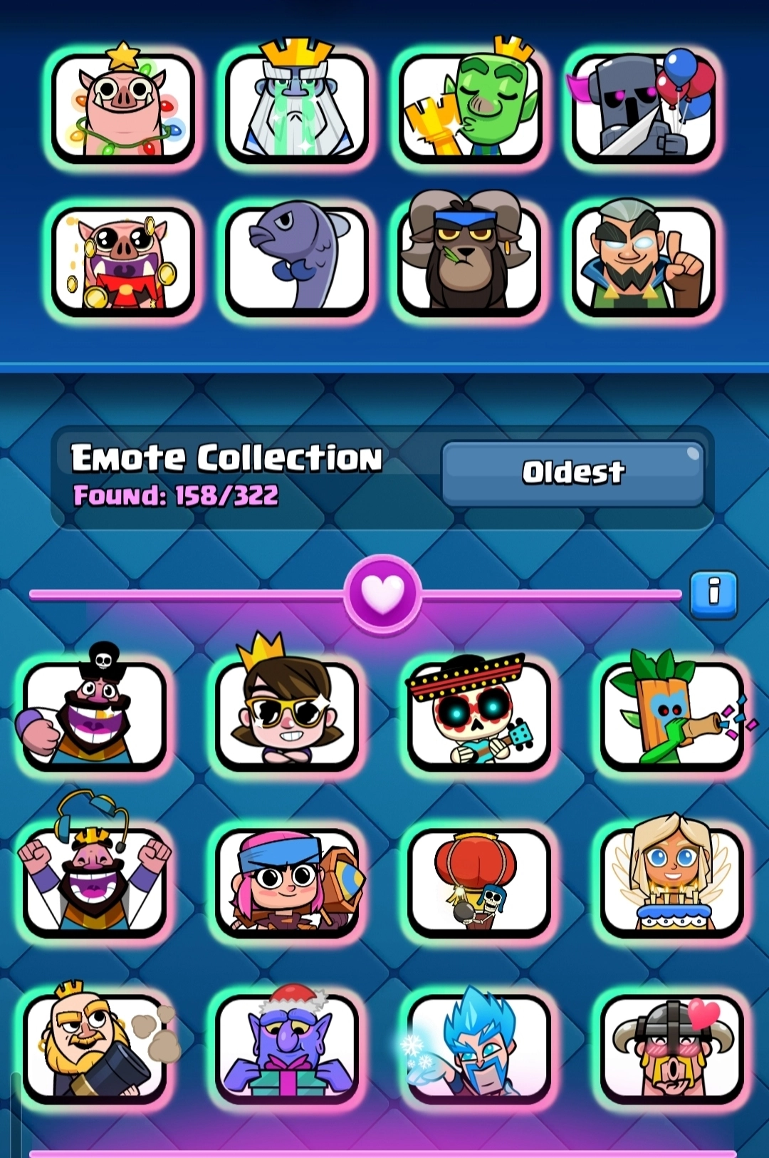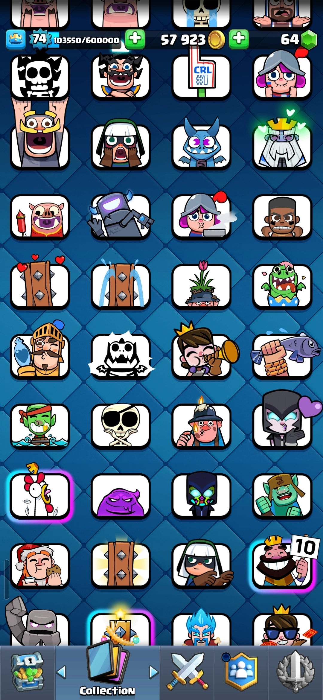 🌸 RAREST EMOTES 🍓 GOBLIN KISSING TROPHY 🏆 S1 FIGHTING FISH 🐟 GRASS CHEWING RAM 🐏 PEKKA BALLOON 🎈 LNY HOG 💰 CRYING GHOST 👻 CHRISTMAS HOG 🎄 MAGIC ARCHER 🏹 74 XP 🎯 ALMOST KT 16 🌟 18 MAX CARDS 💪 16 EVOLUTIONS & 4 HEROES 😈 8 YEARS PLAYED 🏅 12500 TROPHIES 🏆