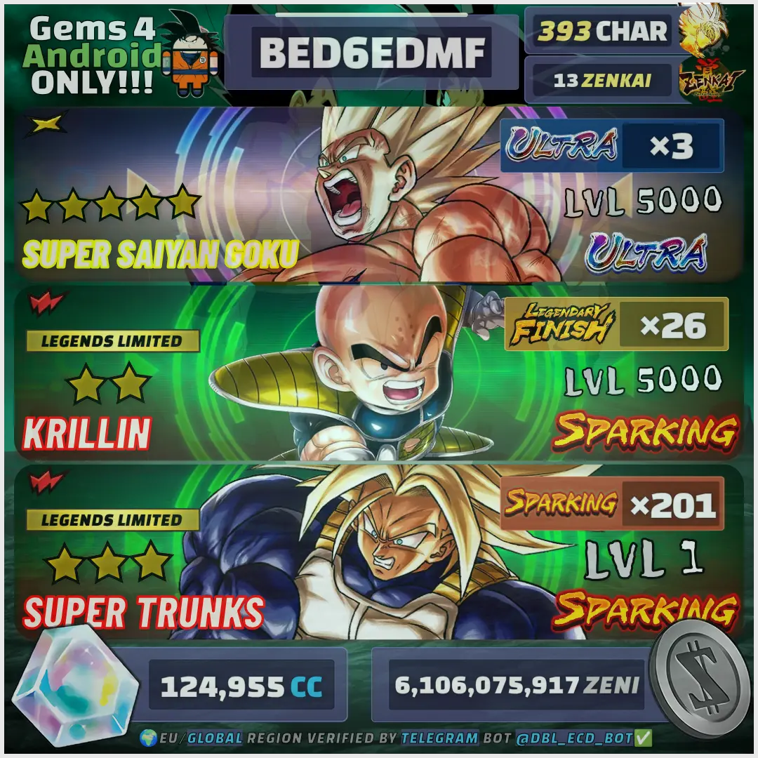 🔥 BEAST DBL Account: [📱 Platform: Android, 👤 Characters: 393, 🌟 Ultra: 3, ⚔️ Sparking: 201, 💎 Crystals: 124955, 👑 Limited: 26, ⚡ Zenkai: 13] ⸱ WHALE ACCOUNT | INSTANT DELIVERY !AGG02523