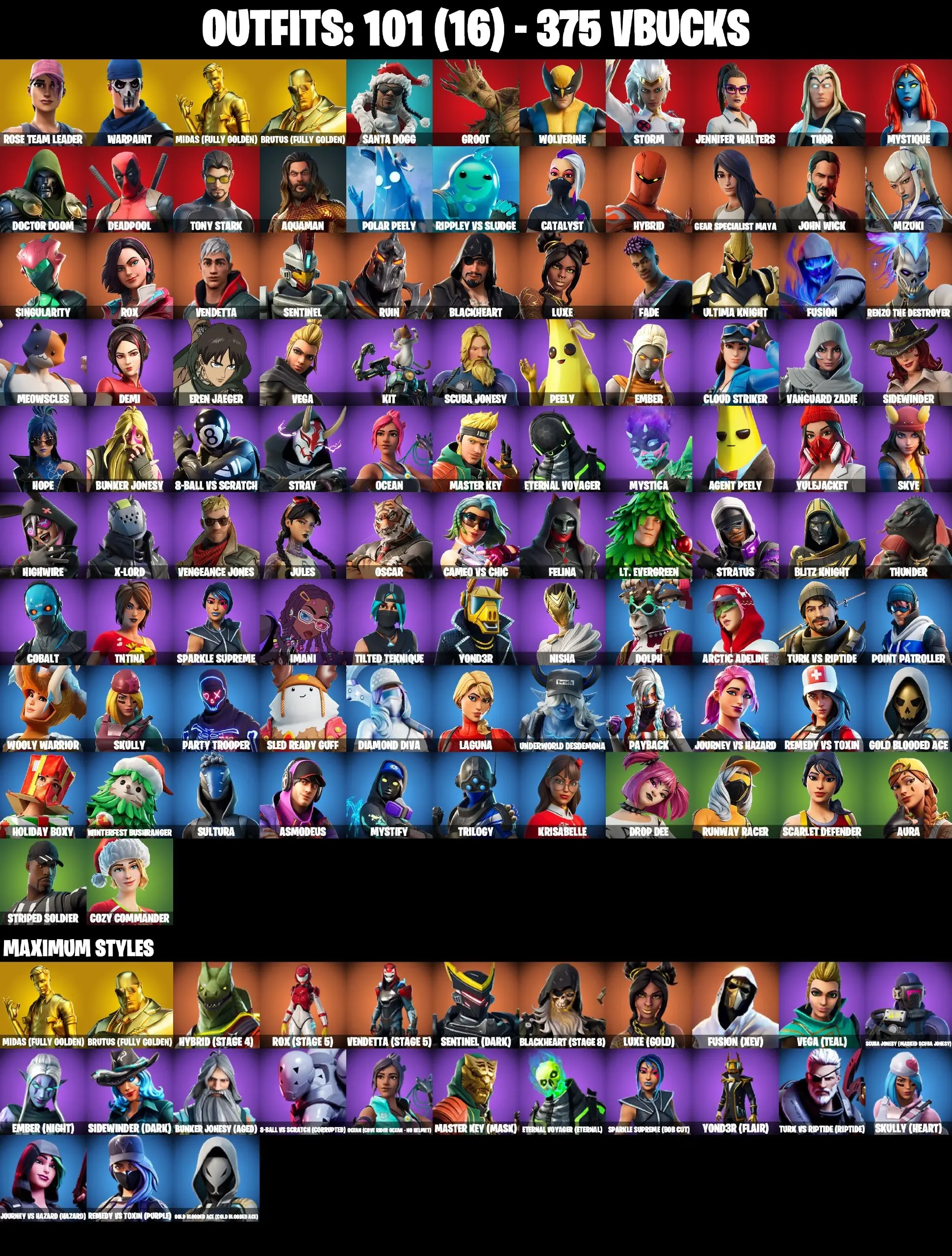 101 SKINS | OG STW FOUNDERS | GOLDEN MIDAS | JOHN WICK | INTRODUCING | STAR WAND | MAYA | AURA | JULES | AGENT PEELY | SKYE | COZY COMMANDER | ASTROWORLD CYCLONE | PEPPERMINT PICK | TAKE THE ELF | CAN PLAY ON PSN,XBOX,PC,NINTENDO,
