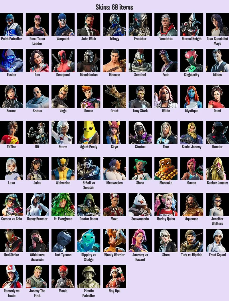 68 Skins|OG STW|Point Patroller|Rose Team Leader|Warpaint|John Wick|Trilogy|Predator|Vendetta|Eternal Knight|Gear Specialist Maya|Fusion