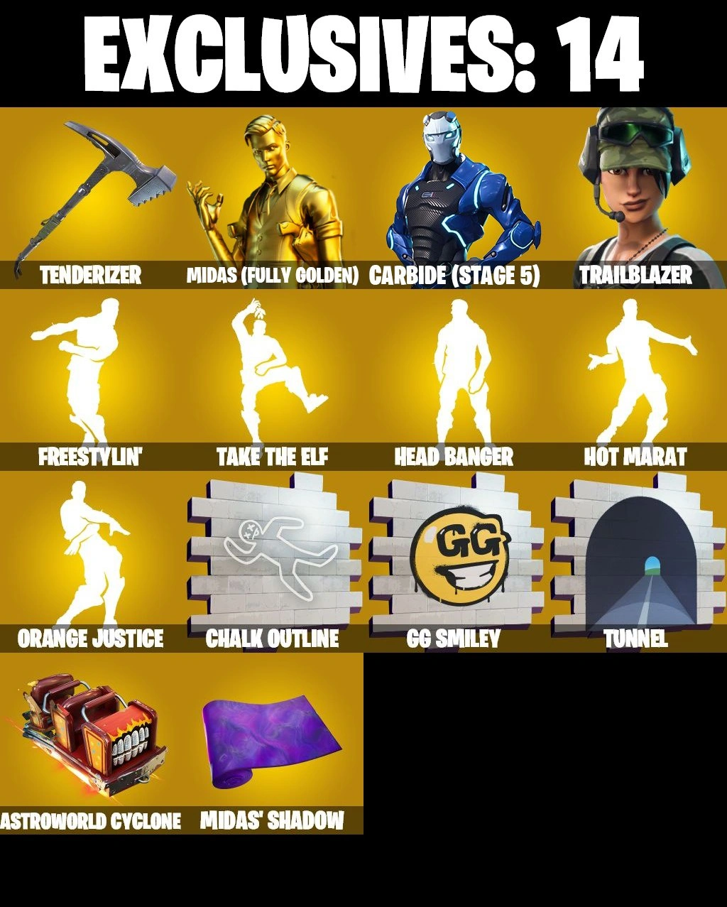 ❤️ 77 SKINS ❤️ TRAILBLAZER ❤️ FREESTYLIN ❤️ LARA CROFT ❤️ OMEGA ❤️ WHIPLASH ❤️ GOLDEN MIDAS ❤️ ORANGE JUSTICE ❤️ ZOEY ❤️ AURA ❤️ ONESIE ❤️ AGENT PEELY ❤️ NOG OPS ❤️ ASTROWORLD CYCLONE ❤️ ICE BREAKER ❤️ TAKE THE ELF
