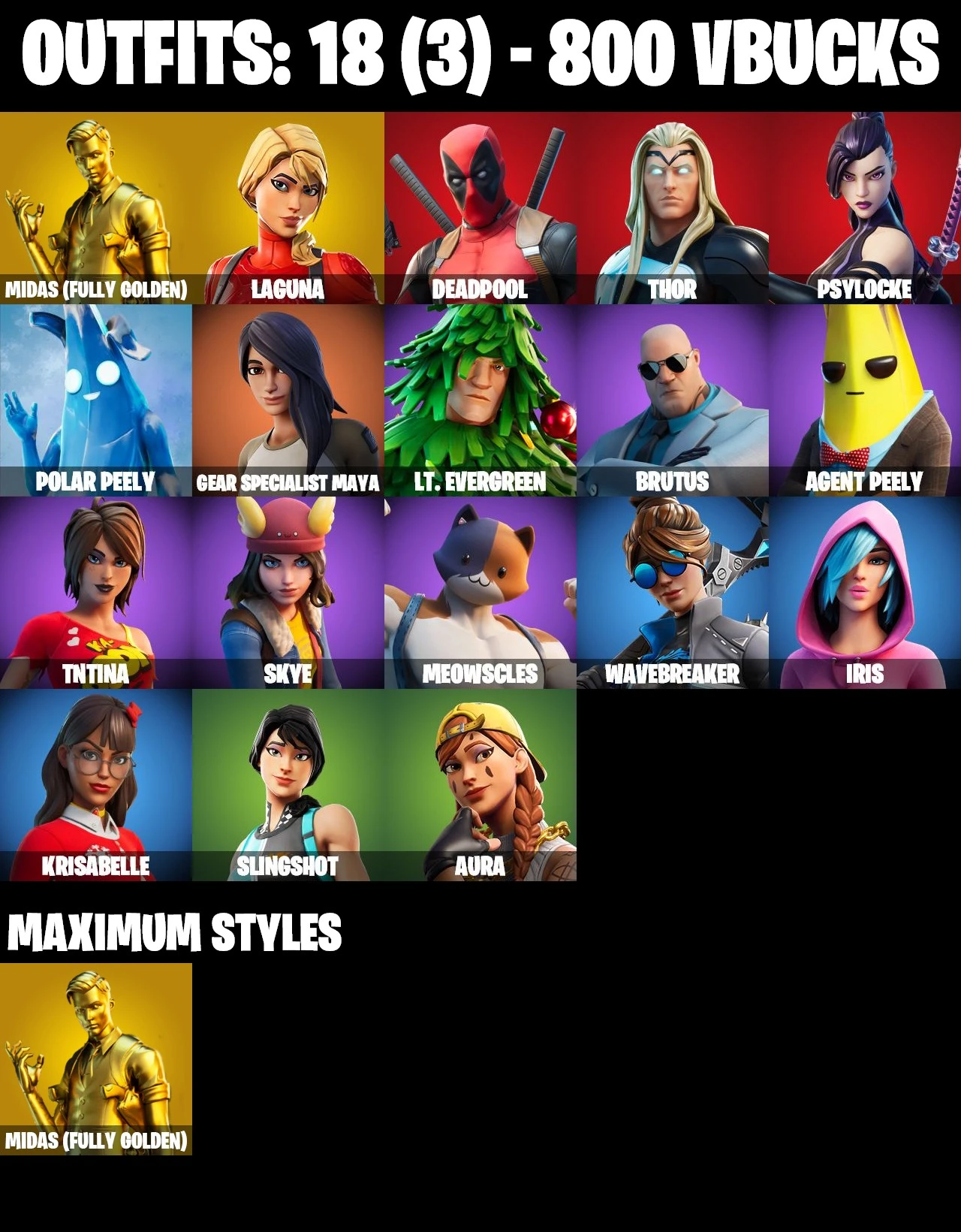 EMAIL CHANGEABLE ✅ [ALL PLATFORMS] ⚡ 18 SKINS 💎 GOLD MIDAS 💜 SING ALONG 💜 LAGUNA 💜 POLAR PEELY 💜 KRISABELLE 💜 AURA 💜 WAVEBREAKER 💜 ASTROWORLD CYCLONE