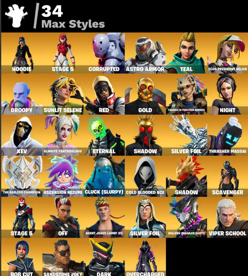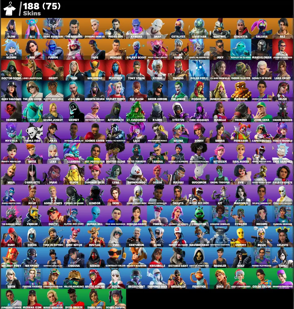 (PC PSN XBOX) 188 skins | MERRY MINT AXE / HARLEY QUINN / LARA CROFT / THE JOKER / GALAXY SCOUT / Glow | Alli | Spire Assassin | The Ageless | Dynamo Dancer | Midas Rex | Kymera | Snap | Catalyst | Leviathan | Sentinel | Vendetta | 250 VB