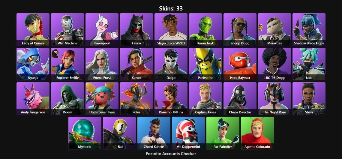 PC/PSN 33 Skins⚡ | Lady of Cranes | War Machine | Gwenpool | Felina | Slayer Juice WRLD | Kyran Aryk | Snoop Dogg | Meowdas | Shadow Blade Hope | Nyanja