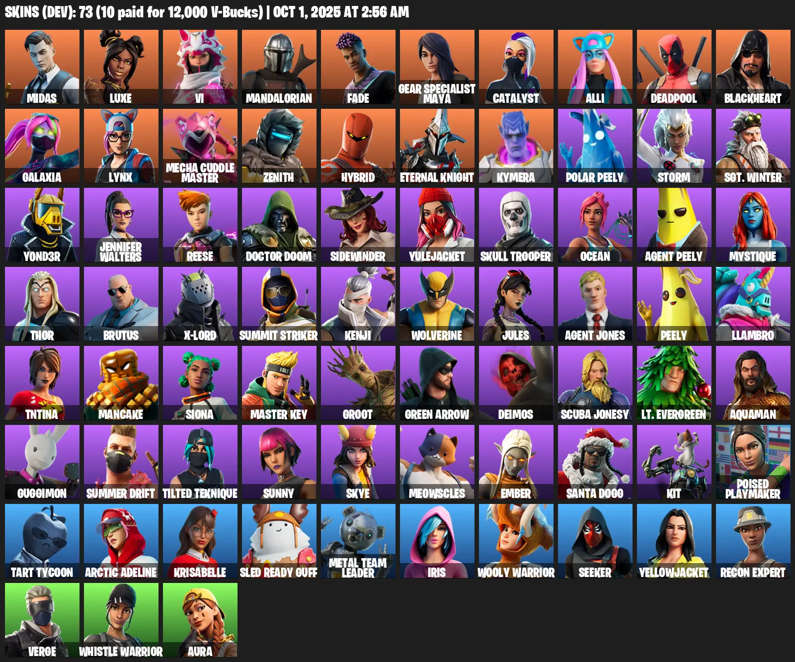 PC/PSN 73 Skins⚡ | Midas | Deadpool | Skull Trooper | Peely | Luxe | Vi | Mandalorian | Fade | Gear Specialist Maya | Catalyst | Alli | Blackheart | Galaxia