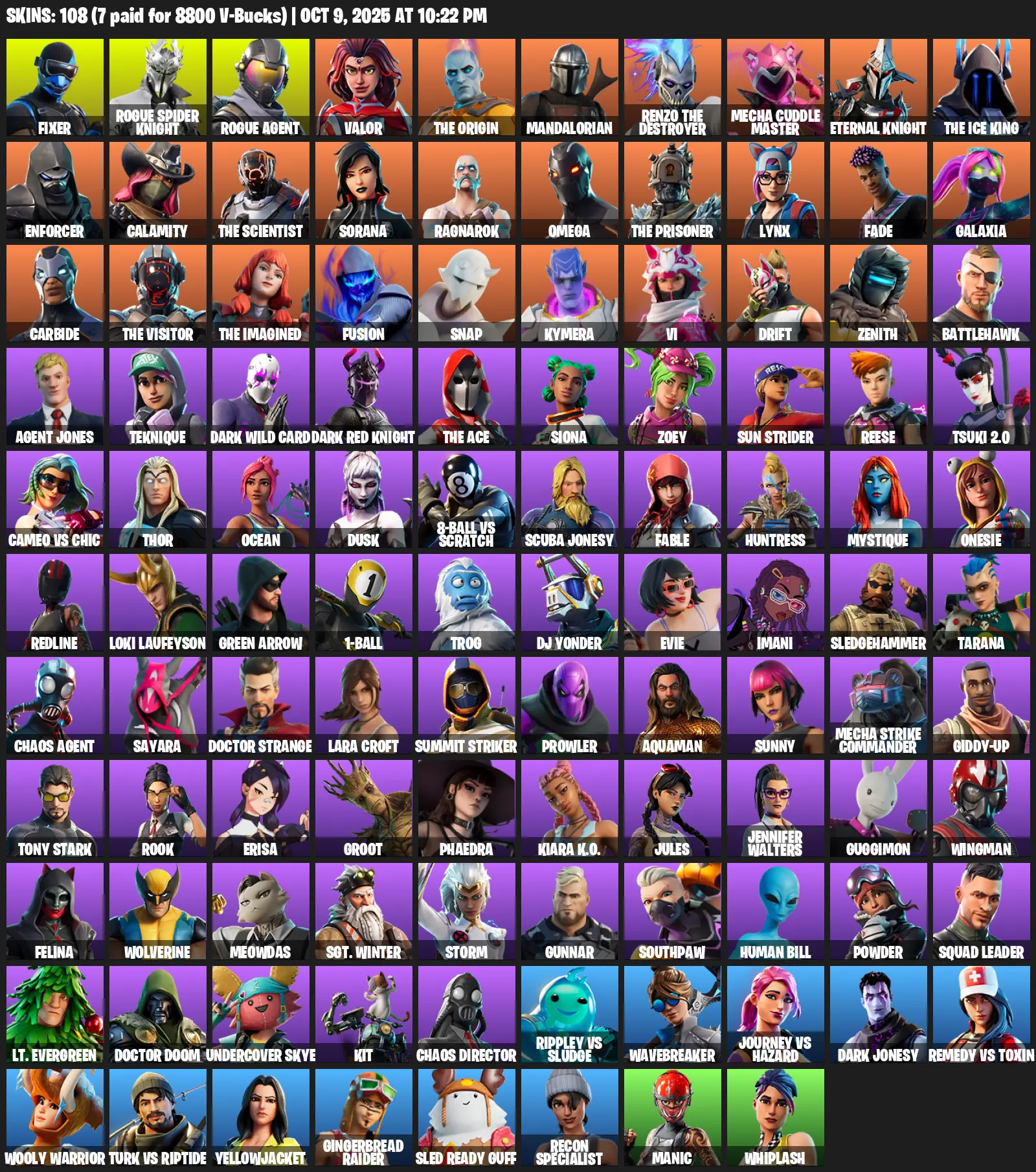[PC/PSN/XBOX] | 108 skins | Merry Mint Axe | Omega | Lara Croft | Fixer | Rogue Spider Knight | Rogue Agent | Valor | The Origin | #KYQ6469 | #MBFN