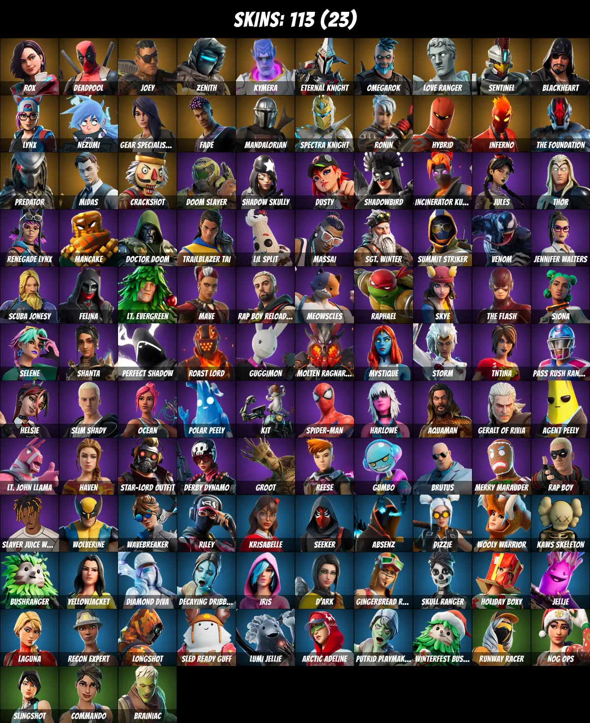 ⚡PC/PSN/XBOX⚡ 113 skins 💎 Deadpool 💎 Midas 💎 Mandalorian 💎 Lynx 💎 Jules 💎 Agent Peely 💎 Go Mufasa 💎 Spider-Man 💎 Venom 💎 Meowscles 💎 Thor 💎 Recon Expert 💎 TNTina 💎 Brutus 💎 Wolverine 💎 Mystique 💎 Doctor Doom 💎 Rox 💎 Joey 💎 Zenith 💎 Kymera 💎 350 V-Bucks 💎