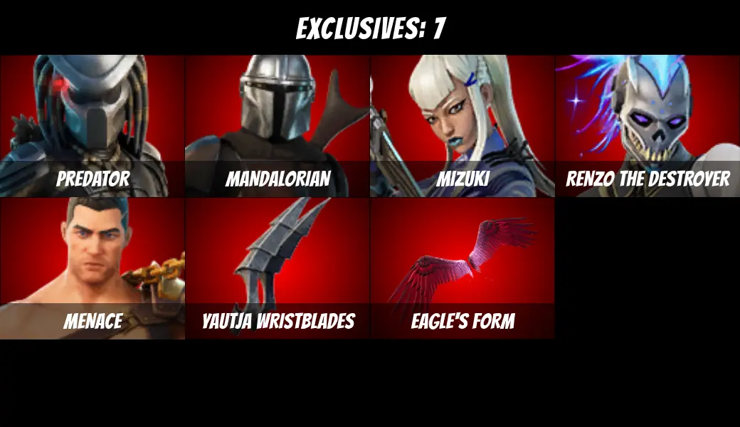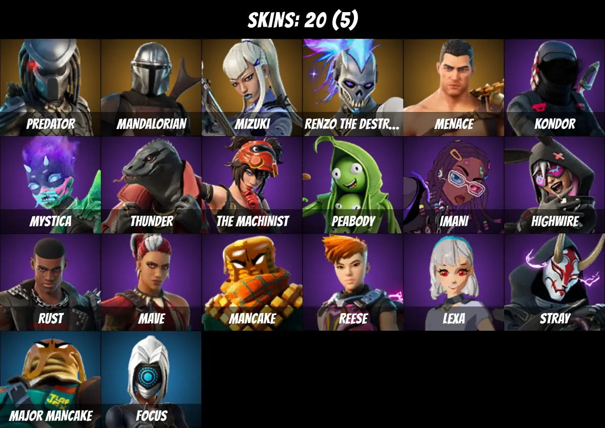 ⚡PC/PSN/XBOX⚡ 20 skins 💎 Mandalorian 💎 Focus 💎 Renzo the Destroyer 💎 Mizuki 💎 Menace 💎 Predator 💎 Yautja Wristblades 💎 Eagle's Form 💎 Kondor 💎 Mystica 💎 Thunder 💎 The Machinist 💎 Peabody 💎 Imani 💎 Highwire 💎 Rust 💎 Mave 💎 Mancake 💎 Reese 💎 250 V-Bucks 💎