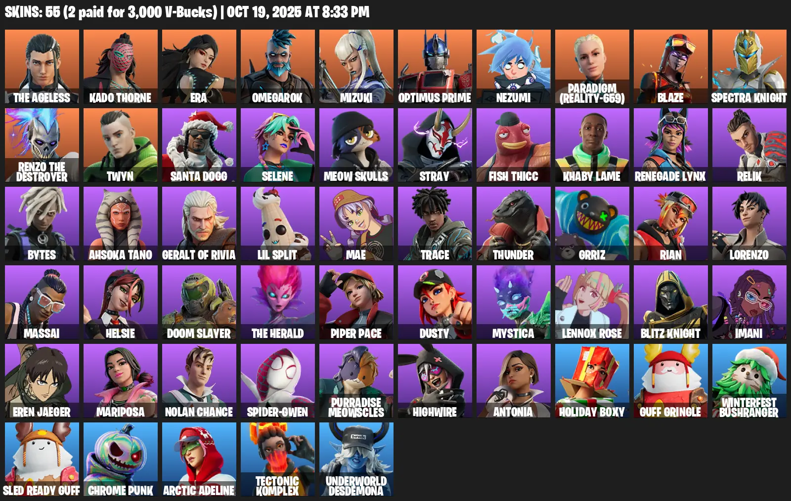 🍨 [PC/PSN/XBOX] 🌟 55 skins | The Ageless , Kado Thorne , OmegaRok , Mizuki , Optimus Prime , Paradigm (Reality-669) , Blaze , Spectra Knight , Renzo the Destroyer | 💙 400 VBUCKS | ✉️ Changeable Email Now