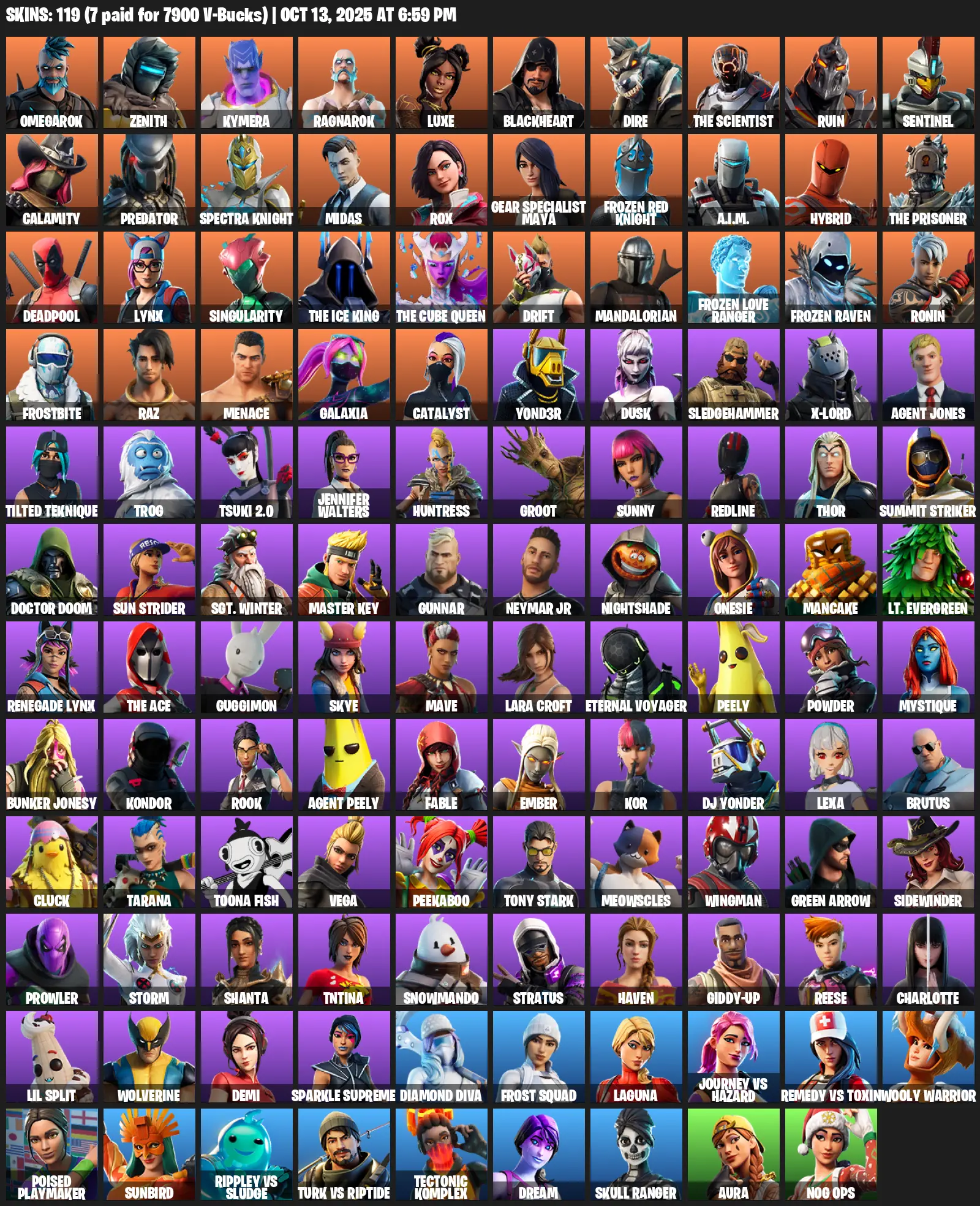 [PC/PSN/XBOX] | 119 skins | 900 V-bucks | Lara Croft | Omegarok | Zenith | Kymera | Ragnarok | Luxe | Blackheart | Dire | #FLV1911 | #MBFN