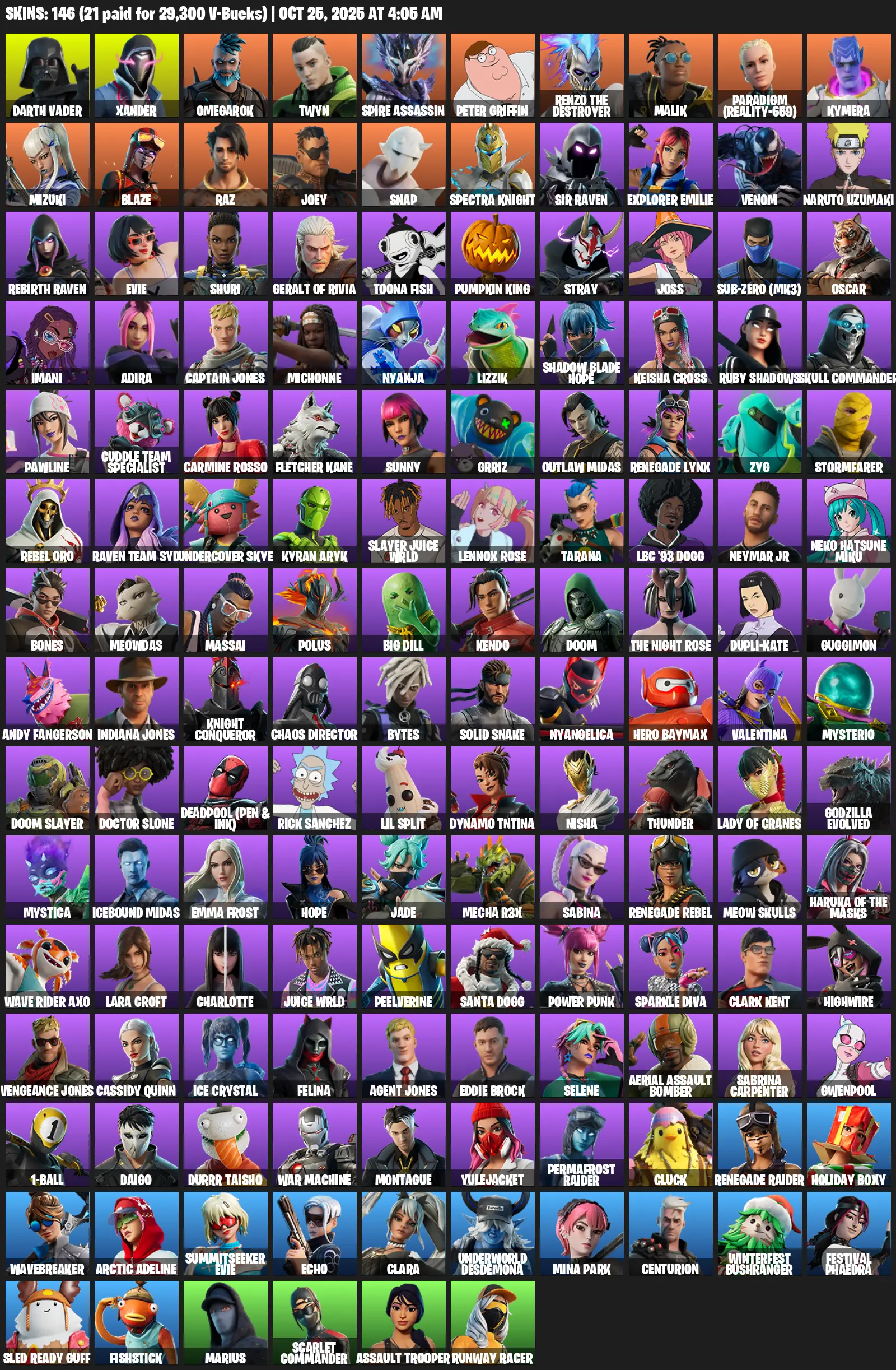[PC/PSN/XBOX] | 146 skins | Renegade Raider | Lara Croft | Darth Vader | Xander | Omegarok | Twyn | Spire Assassin | Peter Griffin | #ZHM2974 | #MBFN