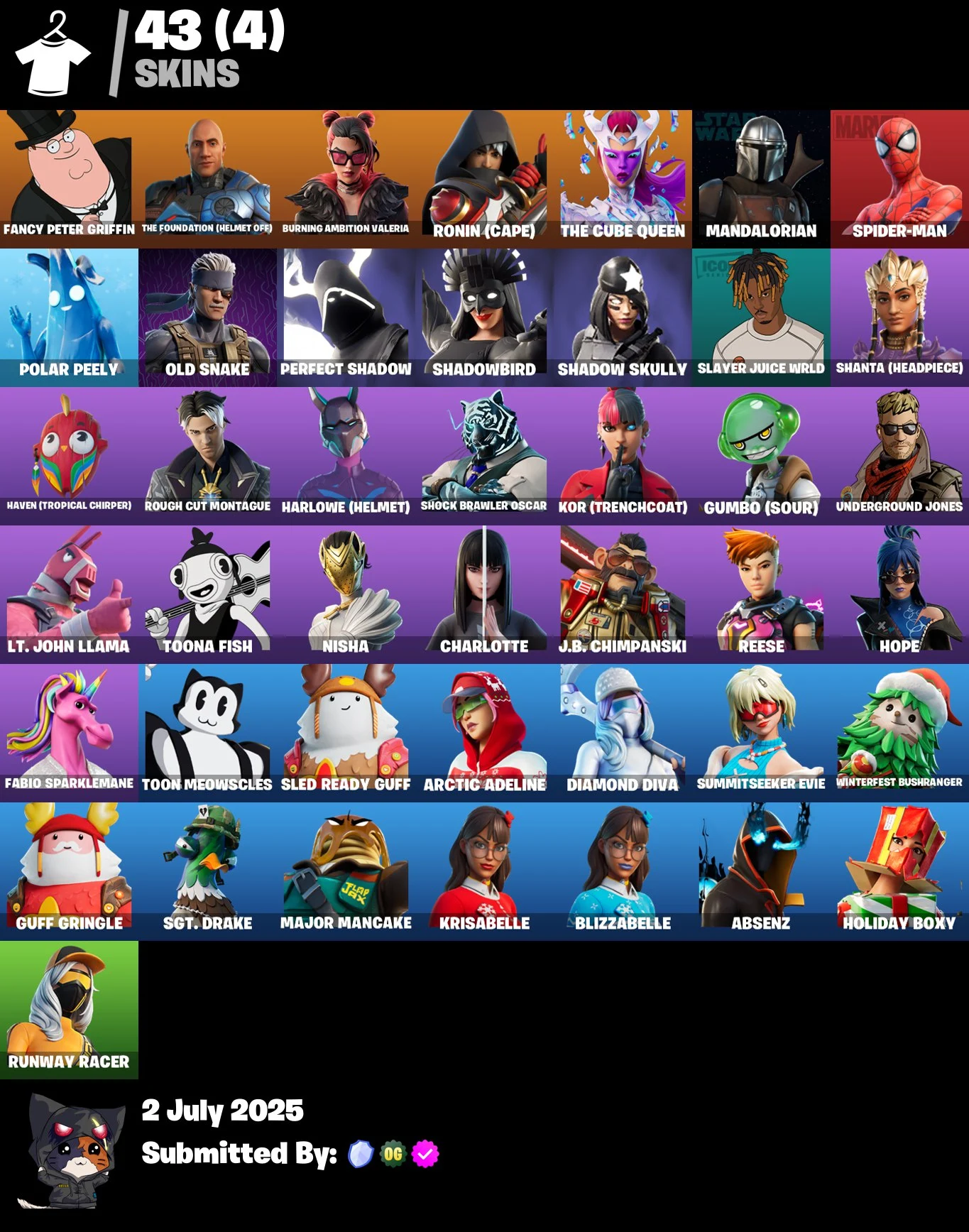 ⭐[PC/PSN/XBOX/NINTENDO/MOBILE] 43 SKINS | FANCY PETER GRIFFIN | THE FOUNDATION (HELMET OFF) | BURNING AMBITION VALERIA | RONIN (CAPE) | THE CUBE QUEEN | MANDALORIAN | SPIDER-MAN | POLAR PEELY | OLD SNAKE | 50 VBUCKS | FULL EMAIL ACCESS