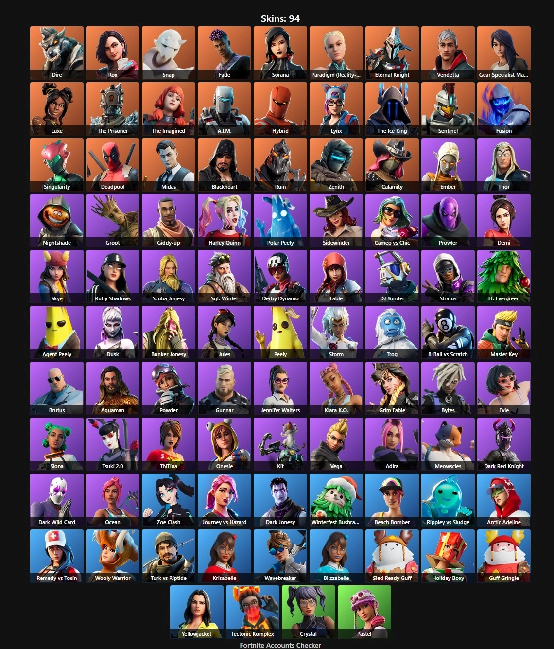 PC/XBOX/PSN 94 Skins⚡ | Deadpool | Midas | Peely | Dire | Rox | Snap | Fade | Sorana | Paradigm (Reality-659) | Eternal Knight | Vendetta