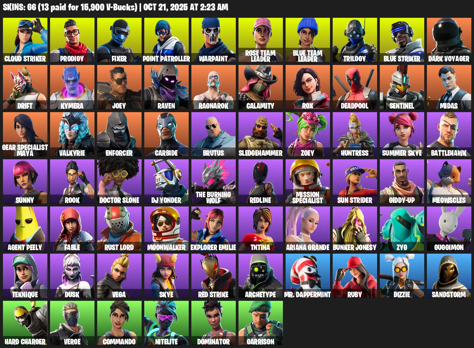 [PSN/XBOX/PC] 66 Skins | Cloud Striker | Prodigy | Fixer | Point Patroller | Warpaint | Rose Team Leader | Blue Team Leader | Trilogy | Blue Striker | Dark Voyager | Drift | Kymera | Joey | Raven | Ragnarok | Calamity | Rox | Deadpool | Sentinel | Midas