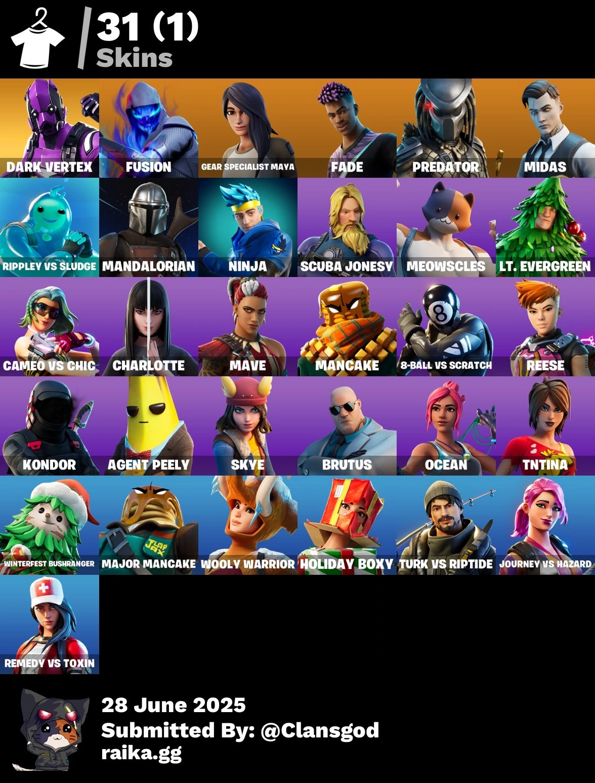 RAREST⭕️DARK VERTEX PACK✨PC/PSN/XBOX🔥31 skins | Dark Vertex | Fusion | Gear Specialist Maya | Fade | Predator | Midas | Rippley vs Sludge | Mandalorian | Ninja | Scuba Jonesy | 50 VB
