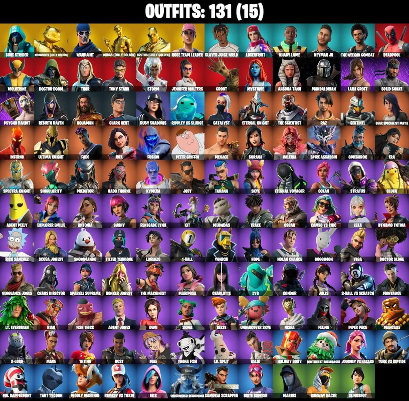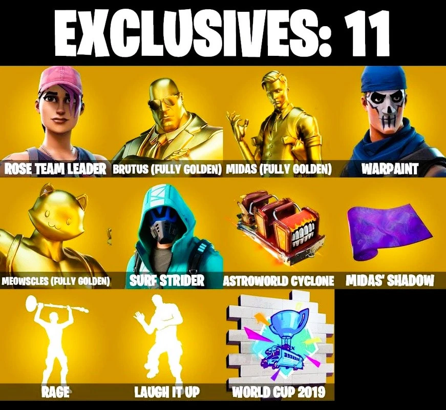STACKED FORTNITE ACCOUNT 131 Skins🎁🌙SURF STRIDER🌙MEOWSCLES FULLY GOLD🌙 ROAST TEAM LEADER 🌙 BRUTUS FULLY GOLDEN 🌙 MIDAS FULLY GOLDEN🌙 WARPAINT🌙LAUGHT IT UP🌙 WORLD CUP 2019🌙475 VB⚡️ Playable on PC / PSN / Xbox / Nintendo Switch ⚡️